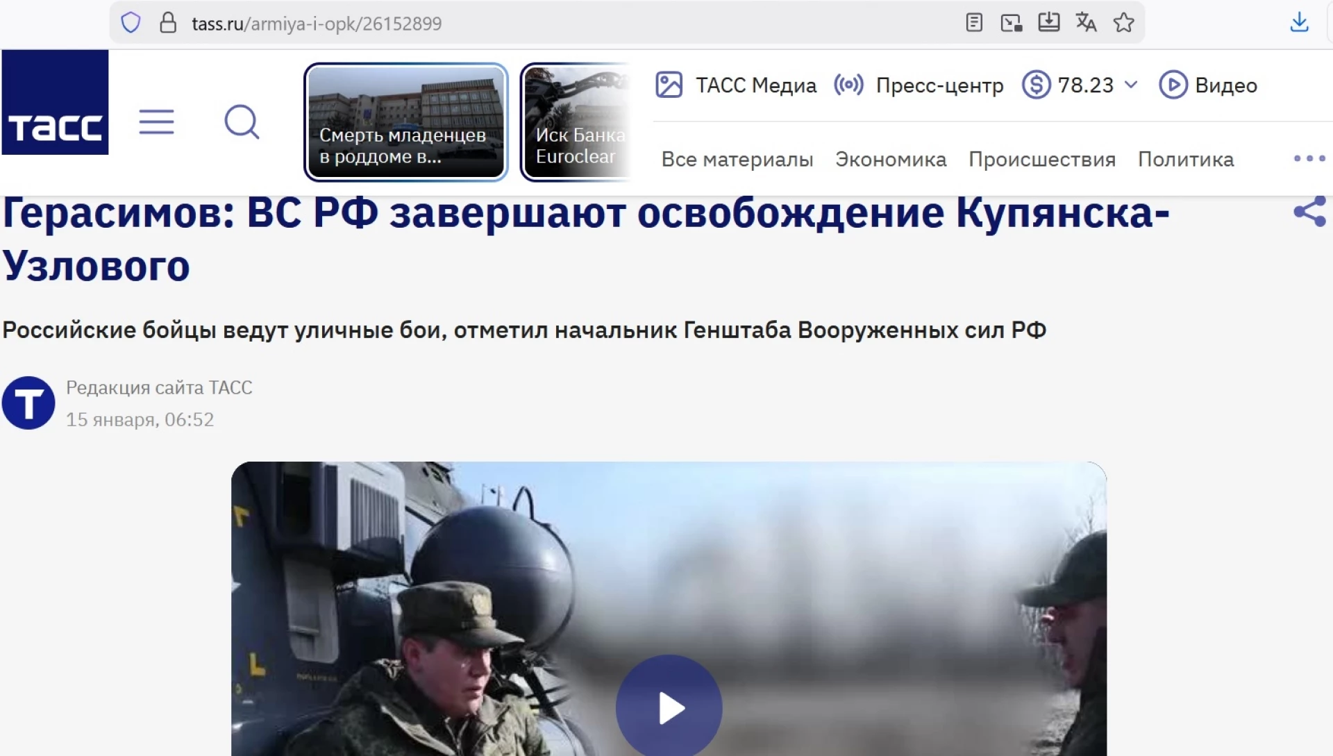 Още един цитат от нея, пак на Герасимов: "Руски войски водят улични боеве с украинските въоръжени сили в село Купянск-Узловаой и завършват освобождаването му".