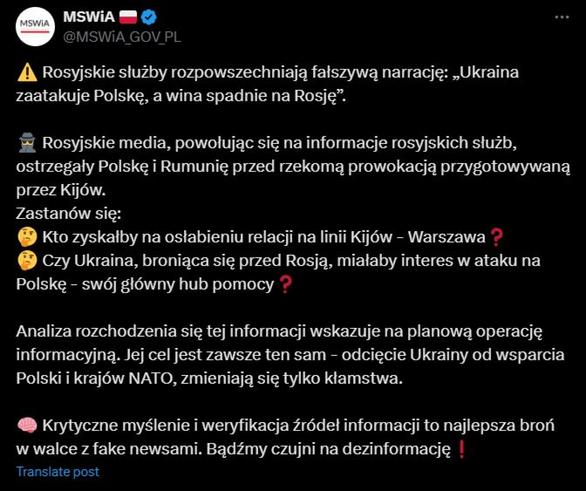 Украйна подготвя провокация като се предвижда атака срещу Полша и Румъния, за което после ще бъде обвинена Русия - такава фалшива информация се разпространява в момента в Полша от руска страна, обяви Министерството на вътрешните работи на Полша.