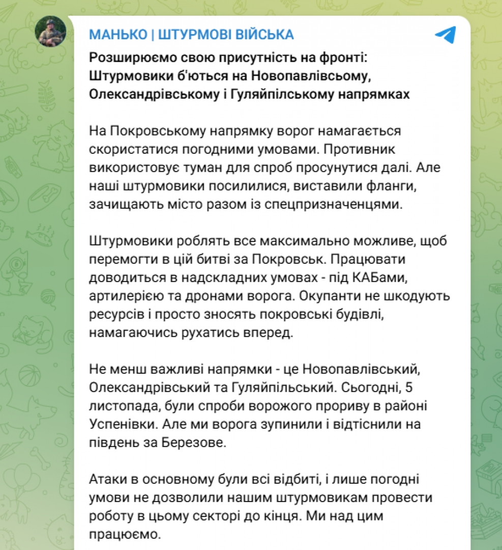 Манко отделя внимание и на направленията Новопавловско, Александровско и Гуляйпилско, които са "не по-малко важни" и където украиските щурмови отряди "разширяват присъствието си".