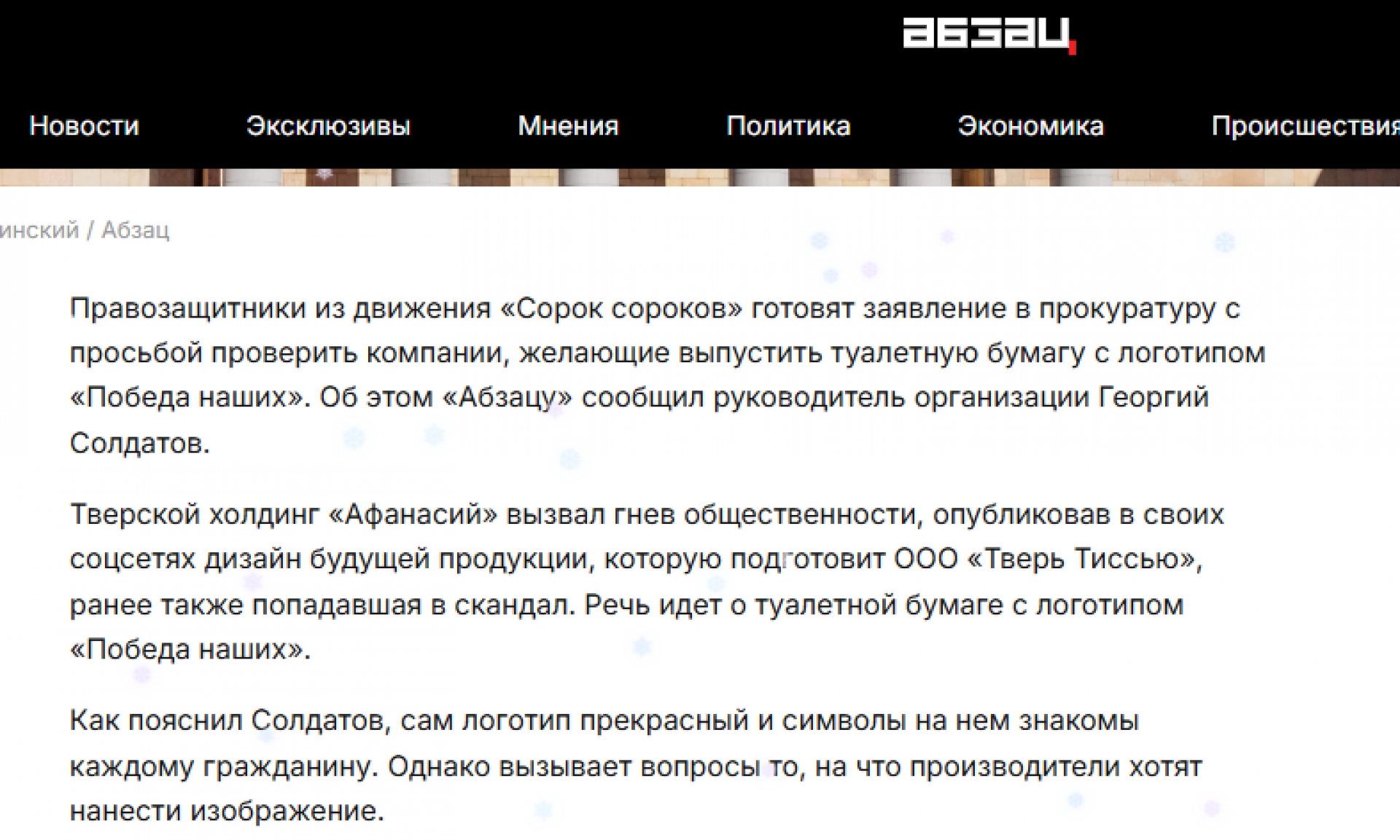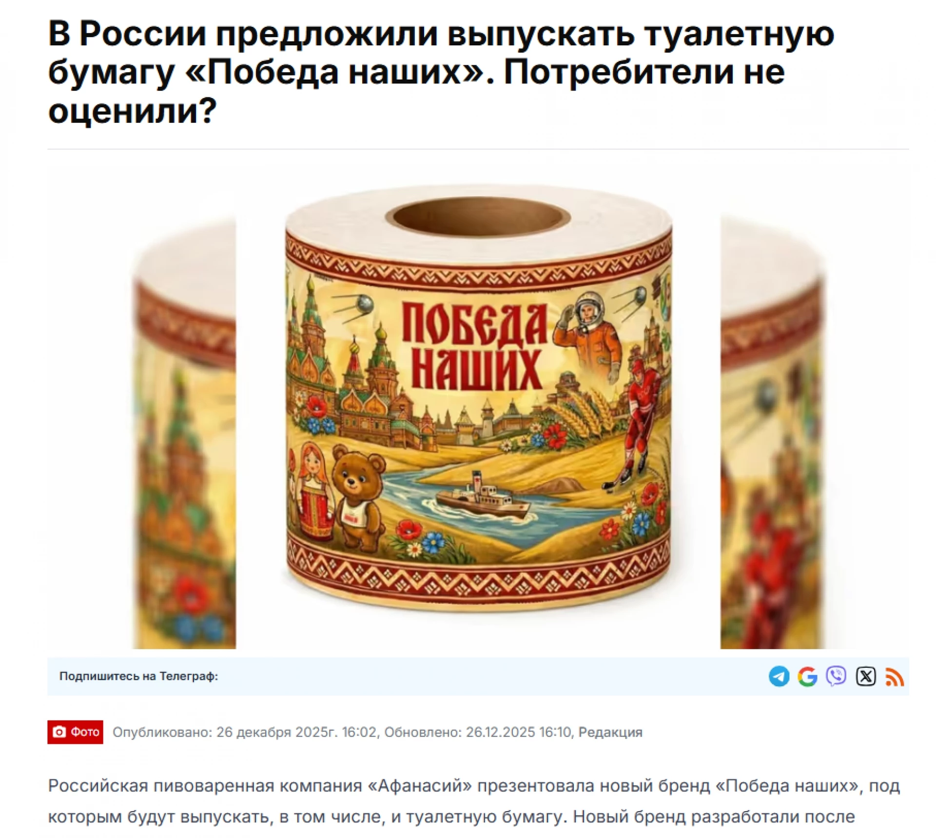 Руският холдинг "Афанасий", известен наред с други неща с производството на бира, представи новата си марка "Победата на нашите". С тази марка ще бъде пусната в продажба патриотична тоалетна хартия. От компанията са обявили, че това ще е своеобразен "принос за укрепването на Русия".