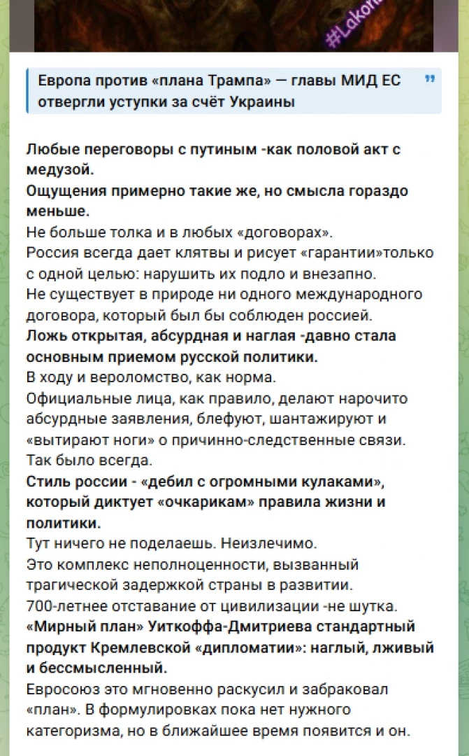 "Всяко преговаряне с Путин е като полов акт с медуза. Усещанията са горе-долу същите, но смисълът е далеч по-малък. Вече няма смисъл от каквито и да било "договори" - Русия винаги дава клетви и изготвя "гаранции" само с една цел: да ги наруши подло и неочаквано." Това пише руският опозиционер и бивш депутат от Държавната дума Александър Невзоров в телеграм канала си. Коментарът му е по повод т. нар. план от 28 точки на Доналд Тръмп, който план на практика, както става ясно, е подготвен от специалния му пратеник Стив Уиткоф (брокер без всякакъв досегашен опит като дипломат, който изненадващо бе натоварен с въпросите около войната Русия-Украйна) и довереното лице на Путин - бизнесмена Кирил Дмитриев.