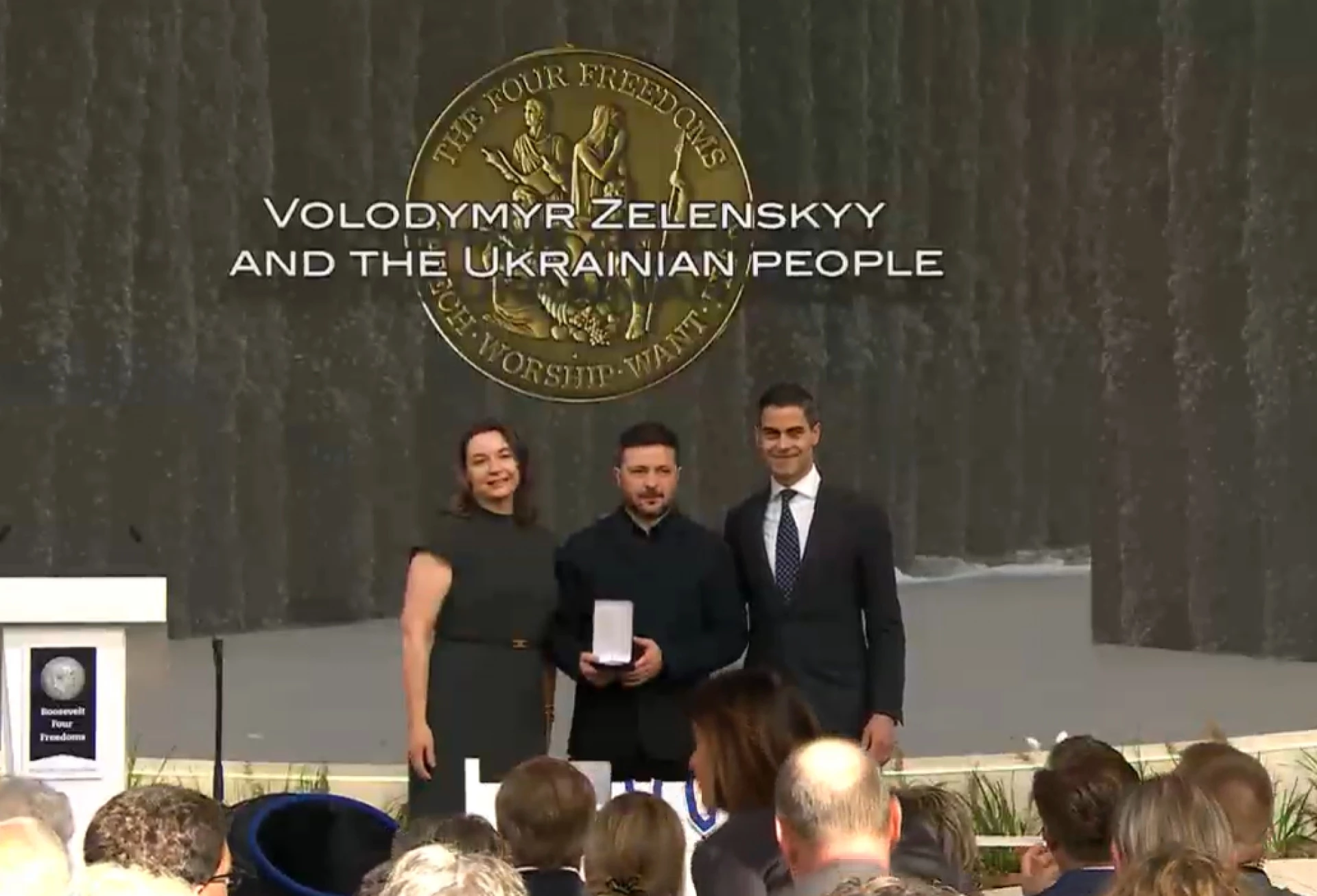 Украинският президент Володимир Зеленски получи от името на целия украински народ Международната награда "Четири свободи" (International Four Freedoms Award) за 2026 г. в Миделбург, Нидерландия. Церемонията се проведе днес, 16 април.