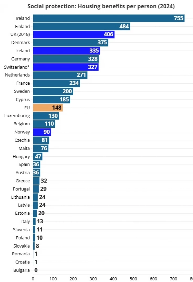 Дания (375 евро), Исландия (335 евро), Германия (328 евро) и Швейцария (327 евро) също са отделили над 300 евро на човек за жилищни помощи. Холандия (271 евро), Франция (234 евро) и Швеция (200 евро) допълват челната десетка.