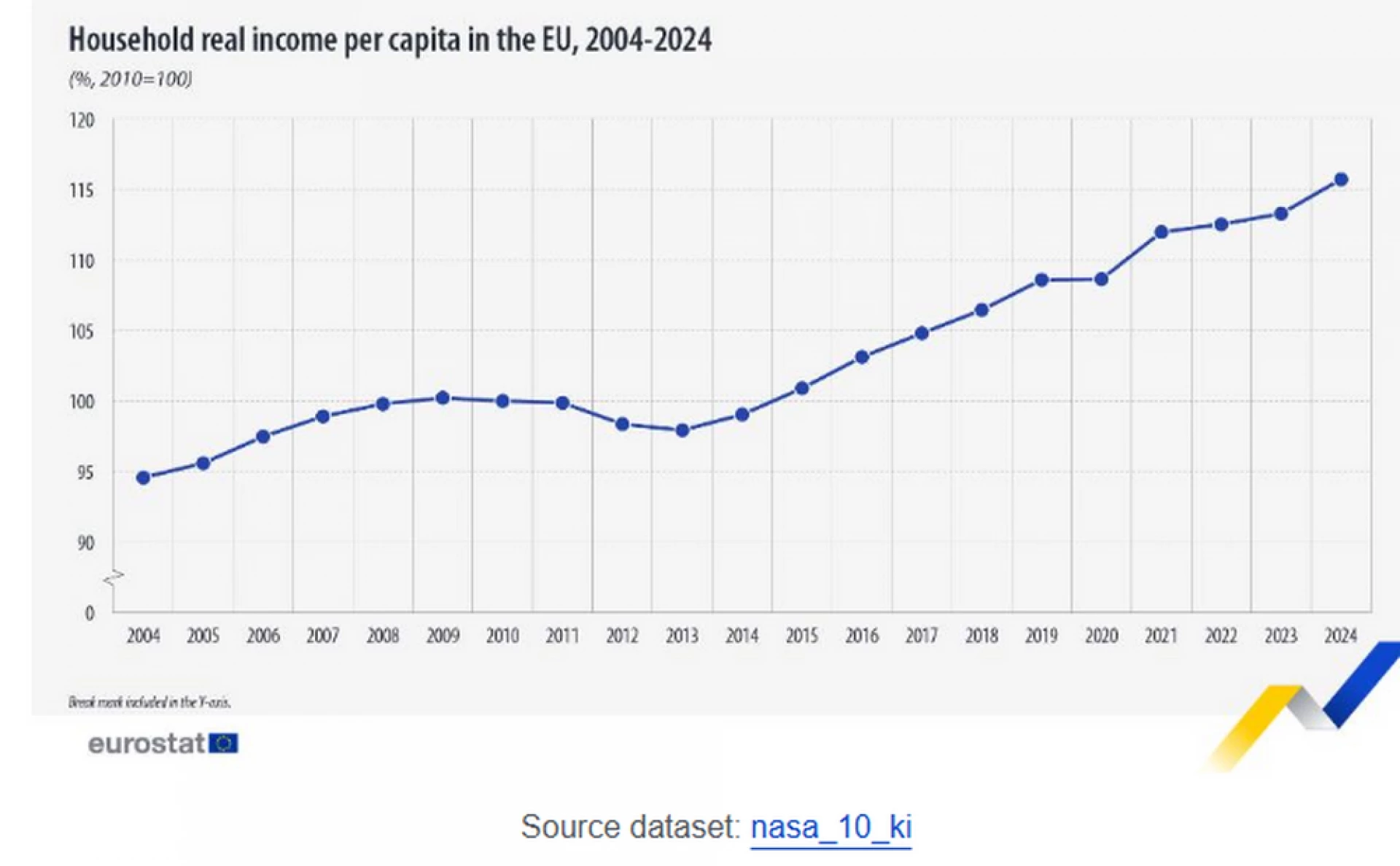 Реалният доход на домакинствата на глава от населението в ЕС между 2004 и 2024 г. е нараснал с 22 на сто. Това съобщава Европейската статистическа служба Евростат. Доходът на глава от населението се е повишавал постоянно, с изключение на периода 2008 - 2011 г., когато е световната финансова криза и през 2020 г., когато се е понижил заради ковид пандемията.