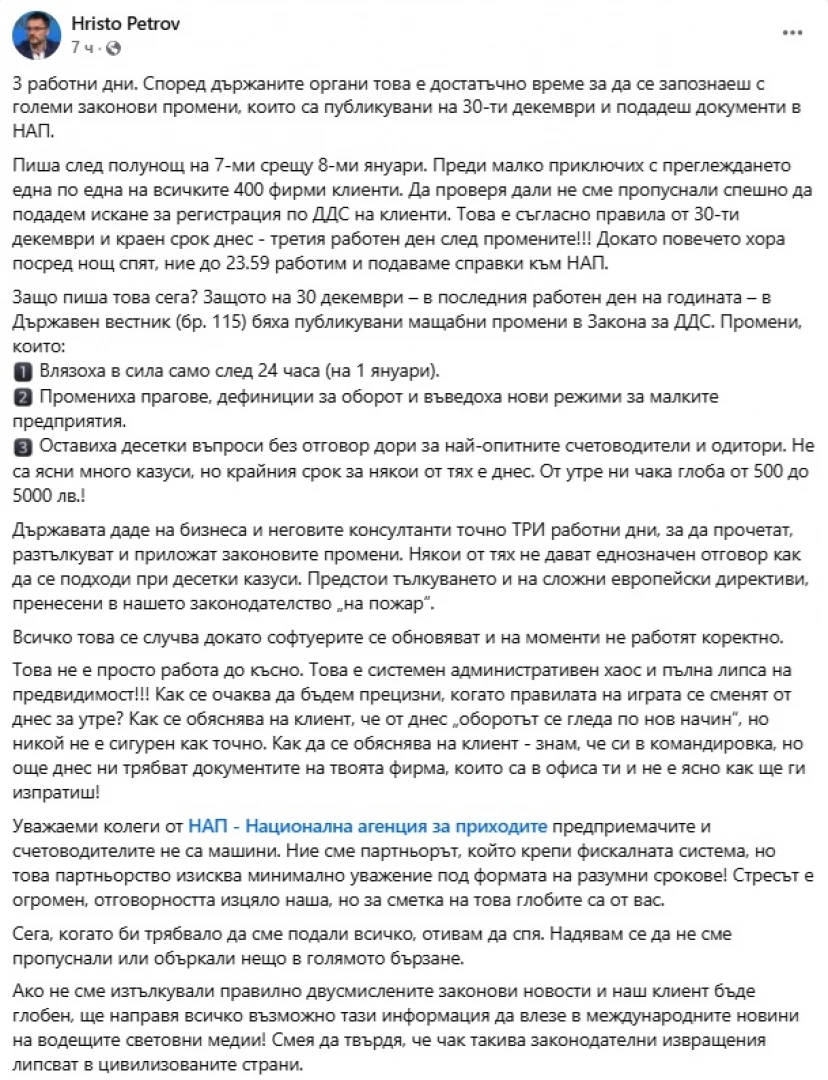 Той недоумява как държавата пришпорва бизнеса с "промени, които: влязоха в сила само след 24 часа (на 1 януари); промениха прагове, дефиниции за оборот и въведоха нови режими за малките предприятия; оставиха десетки въпроси без отговор дори за най-опитните счетоводители и одитори. Не са ясни много казуси, но крайния срок за някои от тях е днес. От утре ни чака глоба от 500 до 5000 лв.!"