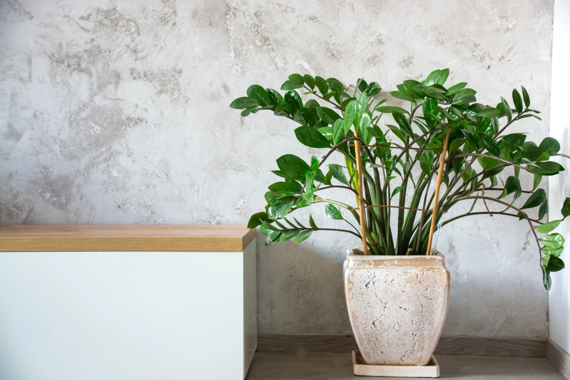 Само имайте предвид, че поносимостта му към слаба светлина не означава, че можете просто да го поставите на тъмно. Ако се отглежда при изключително слаба светлина, може да се разтегне и да стане дългокрако. А това напълно ще съсипе външния му вид. Казано по-просто, ако апартаментът или къщата ви получават много малко или никаква слънчева светлина, трябва да инсталирате изкуствено осветление. Освен това, трябва да го поддържате топло, за да му помогнете да вирее. Растенията ZZ растат много бавно, ако на закрито стане студено. И накрая, имайте предвид, че растението ZZ има средно-силни токсични свойства. Така че, ако търсите стайни растения, които са безопасни за вашите домашни любимци или стайни растения, безопасни за спалнята на вашето дете , по-добре е да потърсите друго стайно растение, което вирее при слаба светлина .