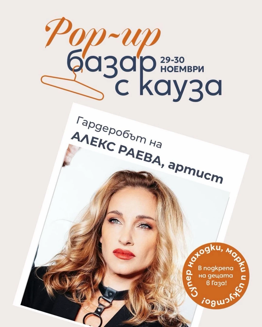 Десетки популярни личности у нас ще се включат в благотворителен Pop-up базар в подкрепа на децата в Газа. Събитието ще се проведе на 29 и 30 ноември от 10:00 до 17:00 часа, в Червената къща на ул. „Любен Каравелов“ 15 в София и обединява артисти, музиканти, дизайнери, брандове и десетки доброволци - всички застанали зад идеята, че подкрепата за най-засегнатите и уязвимите – децата, е общочовешка отговорност.