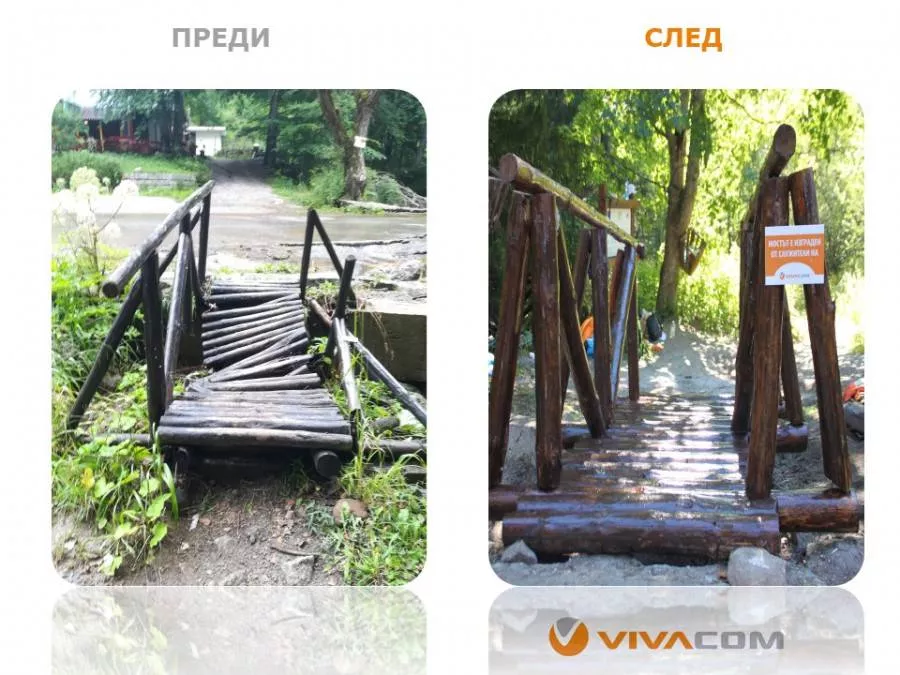 Над 80 младежи от лятната стажантска програма на VIVACOM взеха участие в доброволческа акция в местността "Златните мостове". Едно от любимите места за отдих в природен парк Витоша вече посреща туристите с реставрирани пейки и беседки, освежени указателни табели, почистени алеи и еко пътеки и новоизграден дървен мост.
