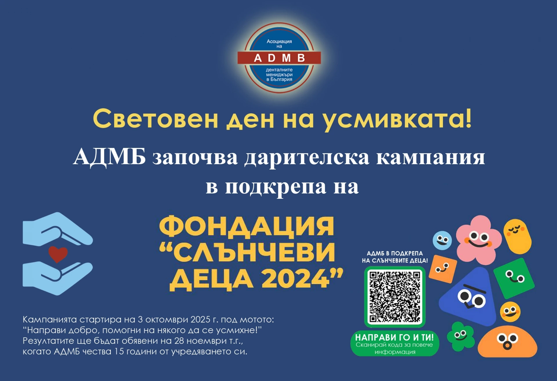 През тази година всички членове на АДМБ - дентални клиники и кабинети от цялата страна - се обединиха около идеята Световният ден на усмивката – 3 октомври 2025 – да даде началото на дарителска кампания в подкрепа на фондация „Слънчеви деца 2024“.