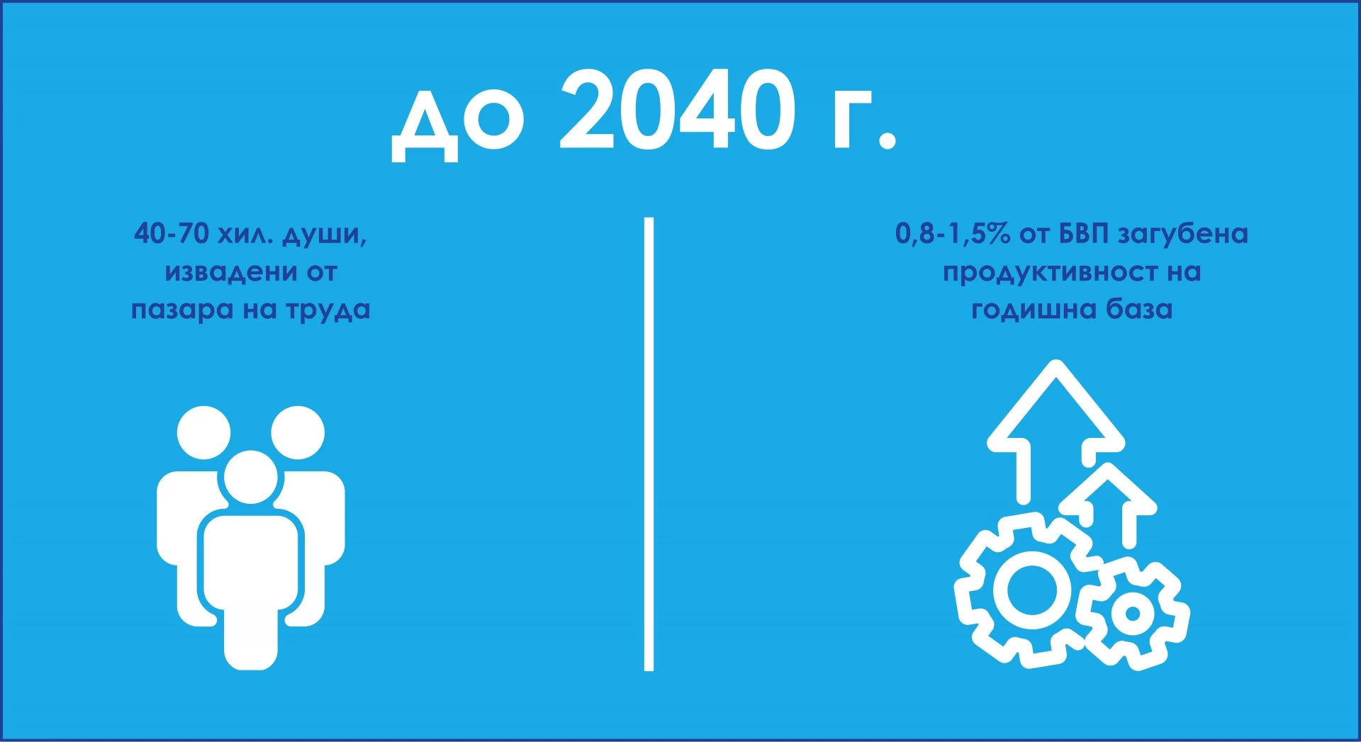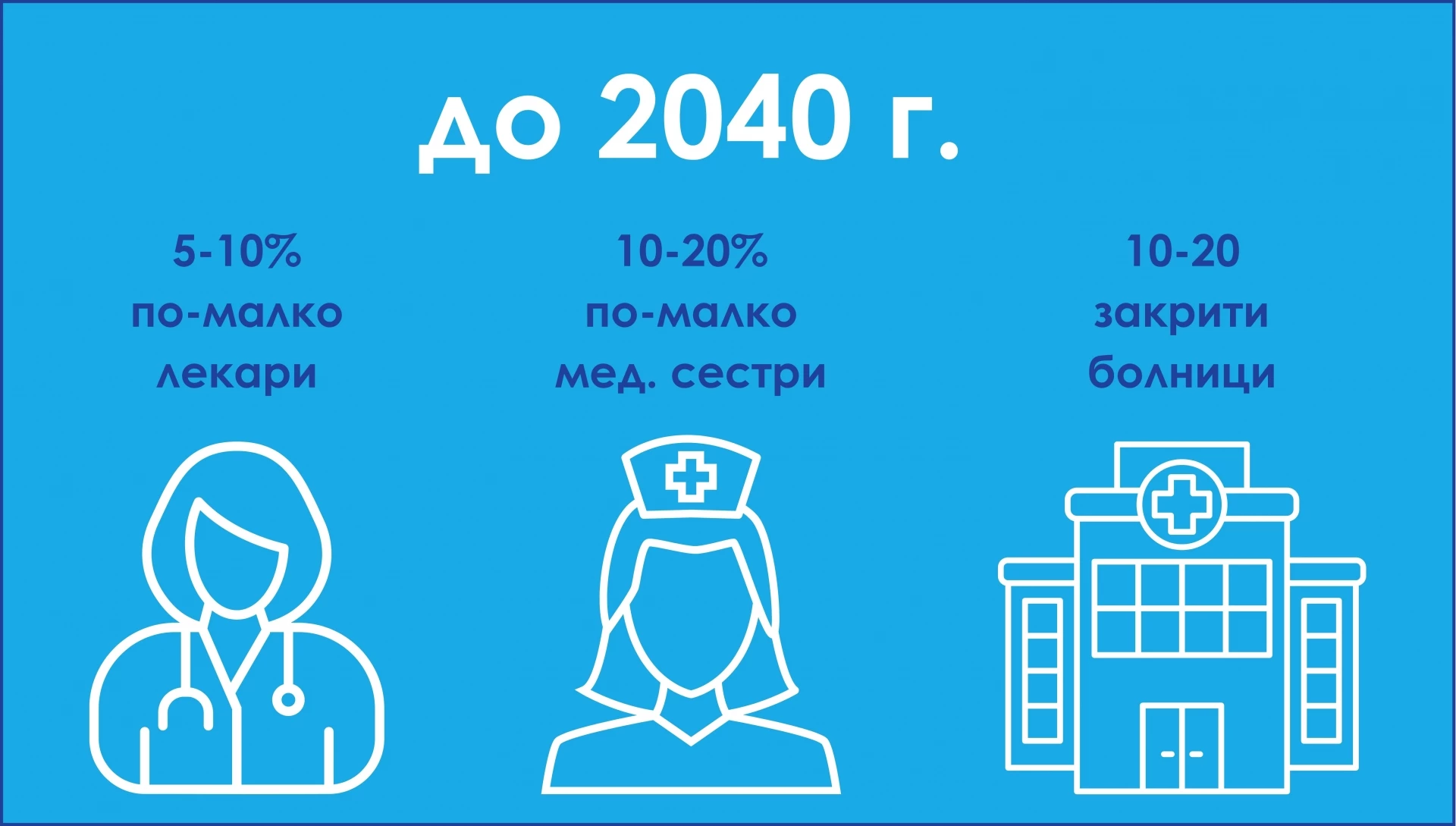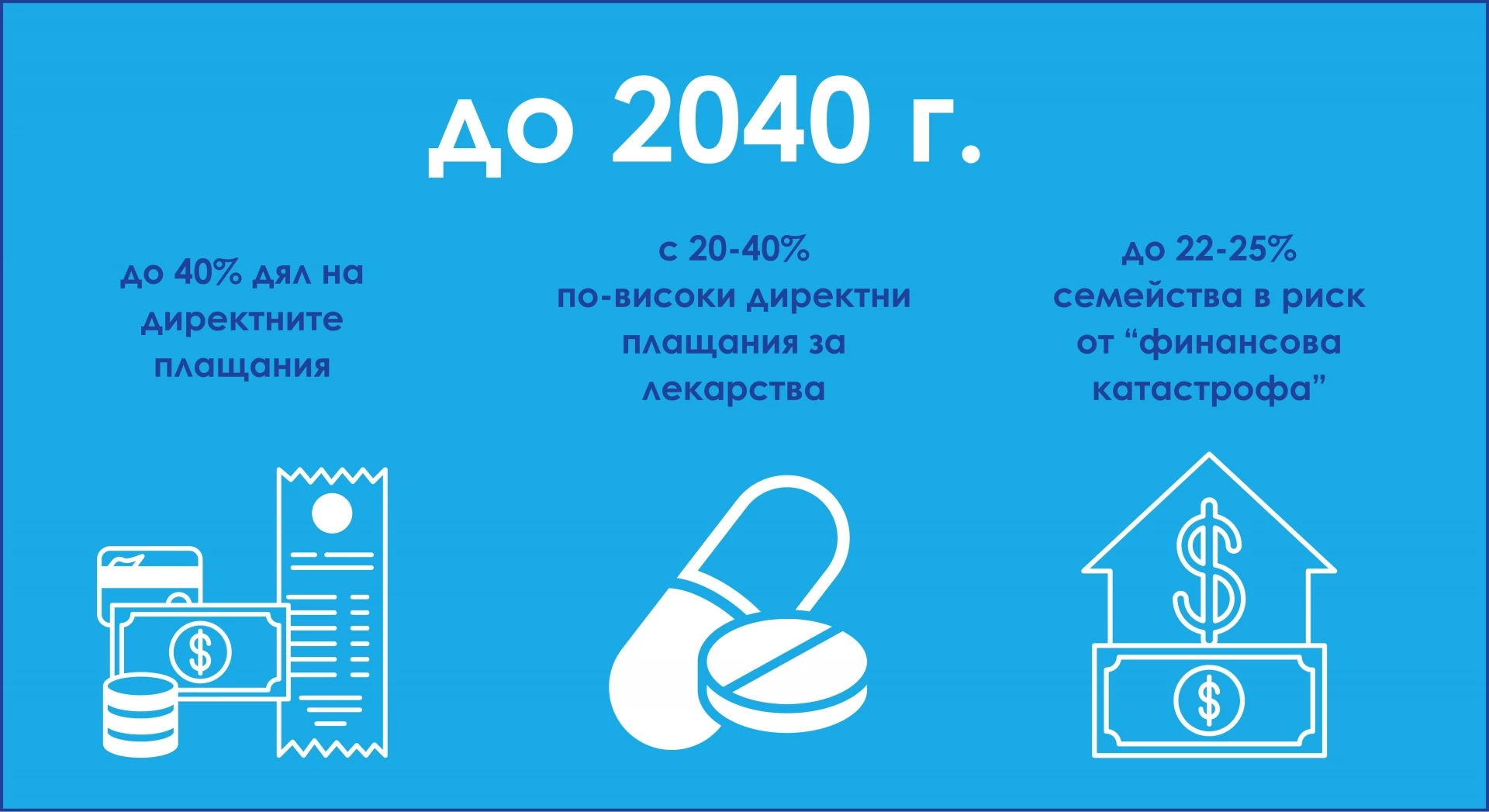 За икономиката също ще има последици. Ако достъпът до лечение се влоши, до 70 000 души могат да отпаднат от пазара на труда до 2040 г. Това пък ще доведе до загуба до 1.5% от БВП годишно. „Цената на бездействието“ ще надхвърли 50 млрд. лв. до 2040 г., измерена в загубена производителност, растящи лични разходи, недостиг на кадри, пропуснати ползи от превенция и ранна диагностика, и обща тежест на заболяванията.