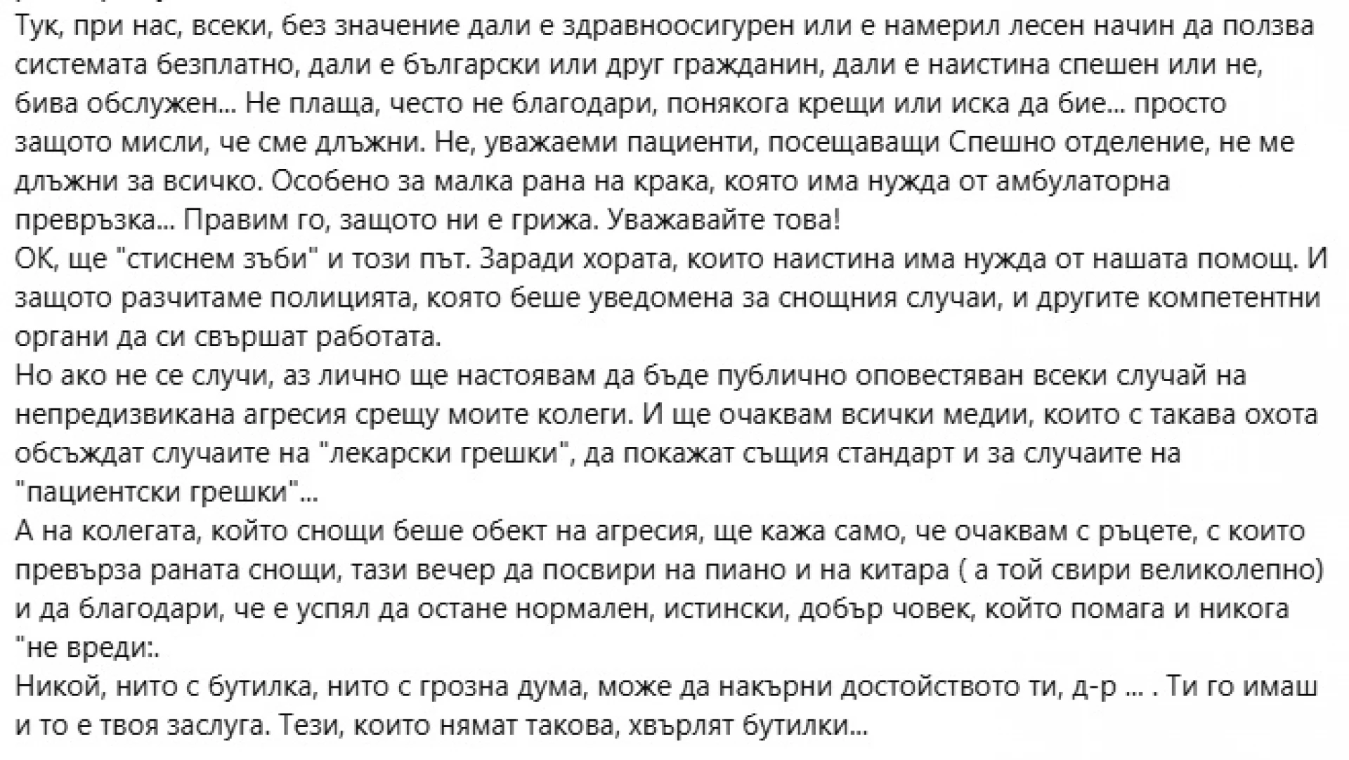 Тя завършва с призив за отразяването не само на "лекарските грешки", но и на грешките на пациентите: "ОК, ще "стиснем зъби" и този път. Заради хората, които наистина има нужда от нашата помощ. И защото разчитаме полицията, която беше уведомена за снощния случаи, и другите компетентни органи да си свършат работата.