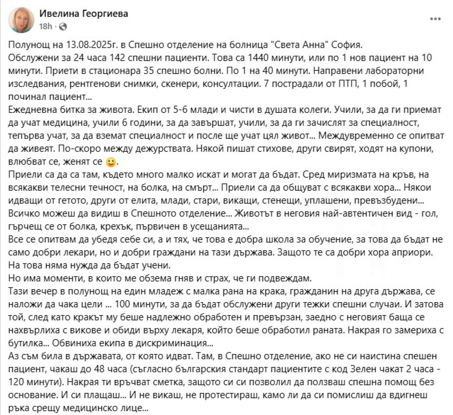 Потресаващ разказ на зам.-директора по медицинската дейност на УМБАЛ "Света Анна" София - Ивелина Георгиева, възмути потребителите в социалните мрежи в последните часове. В публикация в своя профил във Facebook Георгиева разказва за инцидент с проявена агресия от пациент от нощта на 13 август, разразил се в спешното отделение на болницата. По думите ѝ в този ден за 24 часа са били обслужени 142 спешни пациенти: "Това са 1440 минути, или по 1 нов пациент на 10 минути. Приети в стационара 35 спешно болни. По 1 на 40 минути. Направени лабораторни изследвания, рентгенови снимки, скенери, консултации. 7 пострадали от ПТП, 1 побой, 1 починал пациент..." Един пациент обаче, дошъл за обработка на малка рана на крака, по думите на Георгиева, е обиждал лекаря, който го е обслужил, а след това го е замерил и с бутилка.