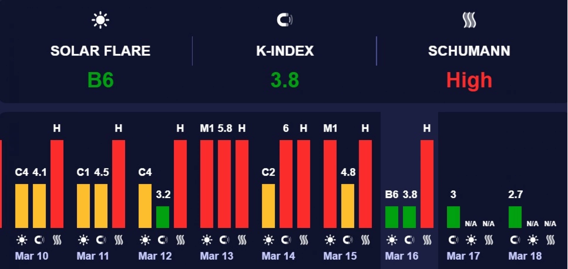 Според прогнозните данни на учените от Центъра за прогнозиране на космическото време към Националната администрация за океаните и атмосферата на САЩ на 16 март стойността на Кр индекса ще е - 4, а на 21 и 22 март 2026 г. ще е 5, което може да доведе до здравословни неразположения при метеочувствителните хора. Тази прогноза не е окончателна и търпи промени в различните дни.