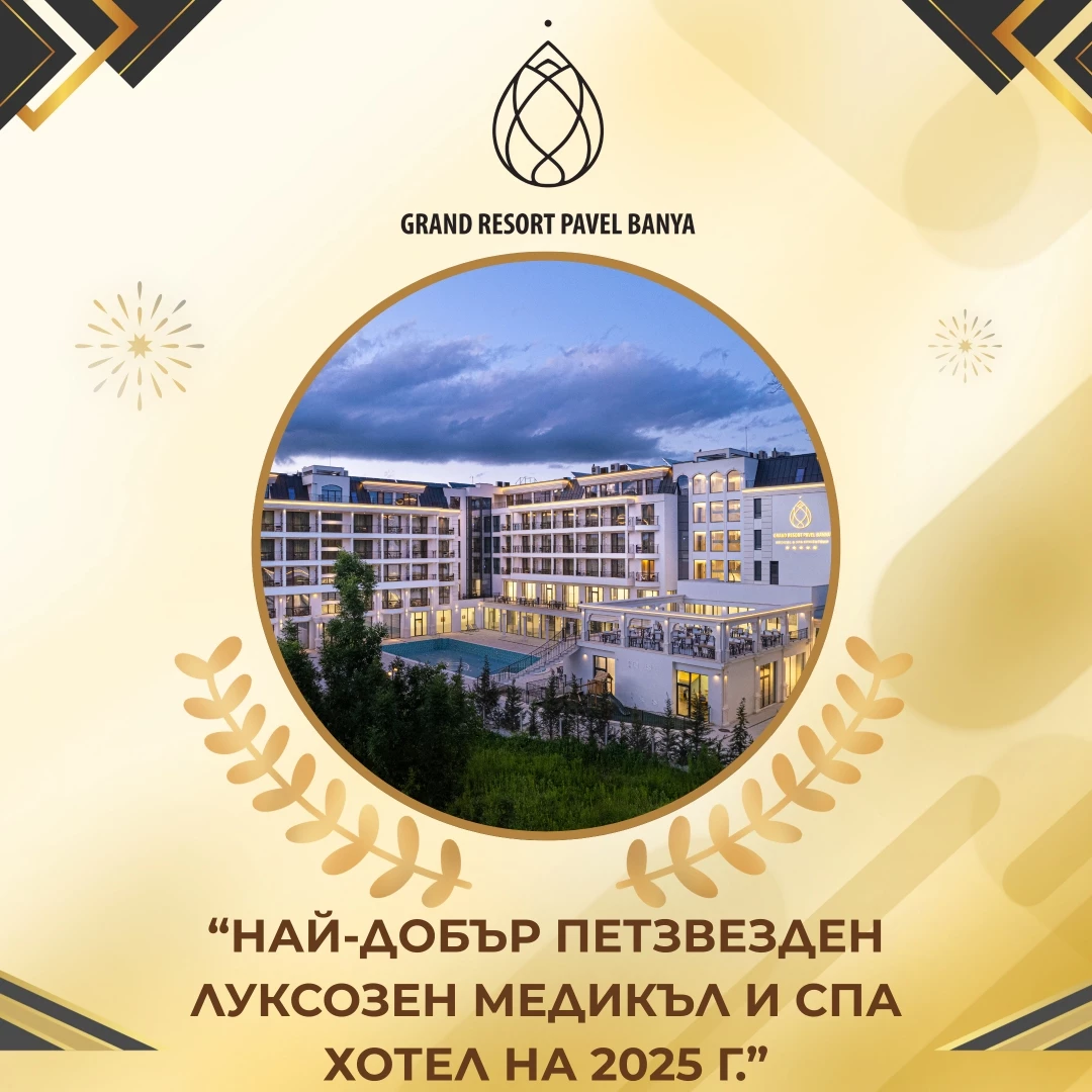Луксозният петзвезден Гранд Резорт Павел баня спечели наградата за най-добър петзвезден луксозен балнеолечебен (Медикъл и СПА) хотел на 2025 г. по време на 30-ите юбилейни награди на Българската хотелиерска и ресторантьорска асоциация (БХРА). Бялото мраморно бижу завоюва една от най-престижните награди у нас в година, изпълнила стотици хиляди гости със специални луксозни изненади в почивки, комбиниращи лечение, вкус за сетивата и процедури за тялото.