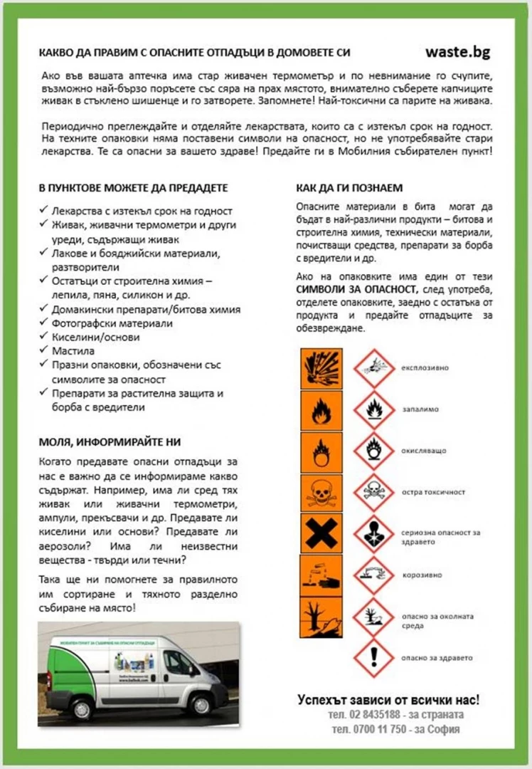 Призоваваме всички жители да се включат активно в кампанията и да се възползват от предоставената възможност за безопасно предаване на опасни отпадъци. С отговорно поведение и съвместни усилия можем да допринесем за по-чиста околна среда и по-добро здраве за всички.