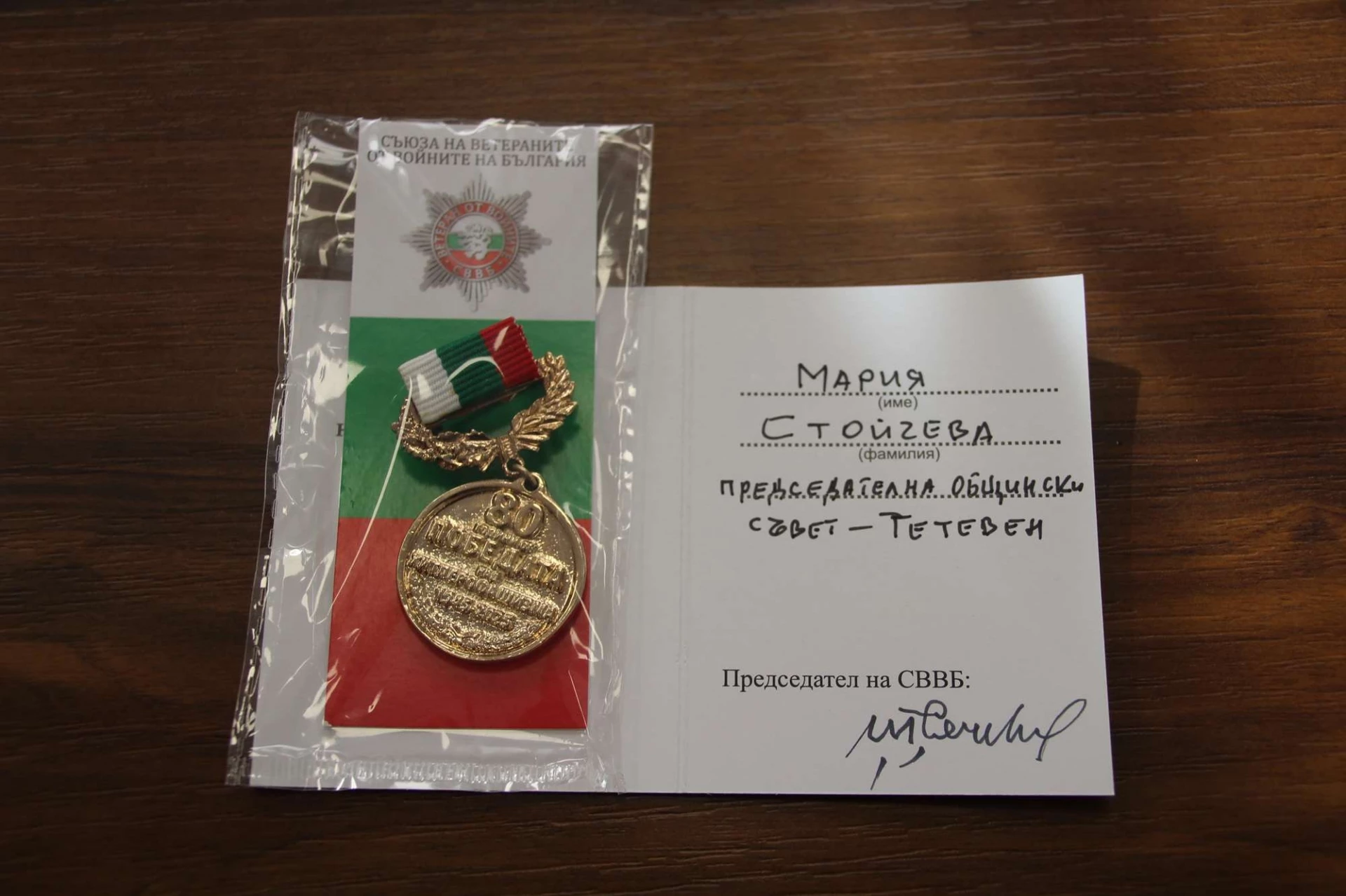 Кметът на Община Тетевен – д-р Мадлена Бояджиева бе удостоенa с юбилеен медал „80 години от победата над хитлерофашизма (1945-2025)“. Отличието бе връчено от членовете на Общинската организация на Съюза на ветераните от войните на България (СВВБ) в гр. Тетевен.