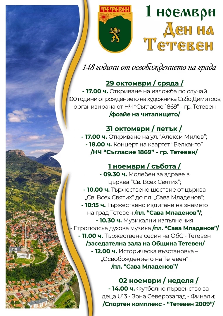 На 1 ноември Тетевен ще отбележи двоен празник - 148 години от освобождението на града от османско владичество и Деня на народните будители. По случай събитията Община Тетевен е подготвила богата програма в дните от 31 октомври до 2 ноември.