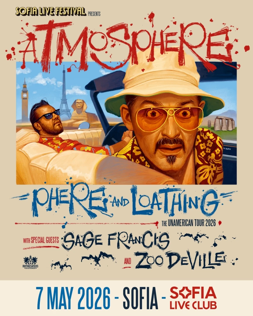 Легендарното американско хип-хоп дуо Atmosphere се завръща в София на 7 май 2026 г. с турнето Phere & Loathing: The Unamerican Tour – концерт, който носи истории за белезите, оцеляването и музиката, която пораства заедно със своята публика. Събитието ще се проведе в Sofia Live Club, по покана на Sofia Live Festival.