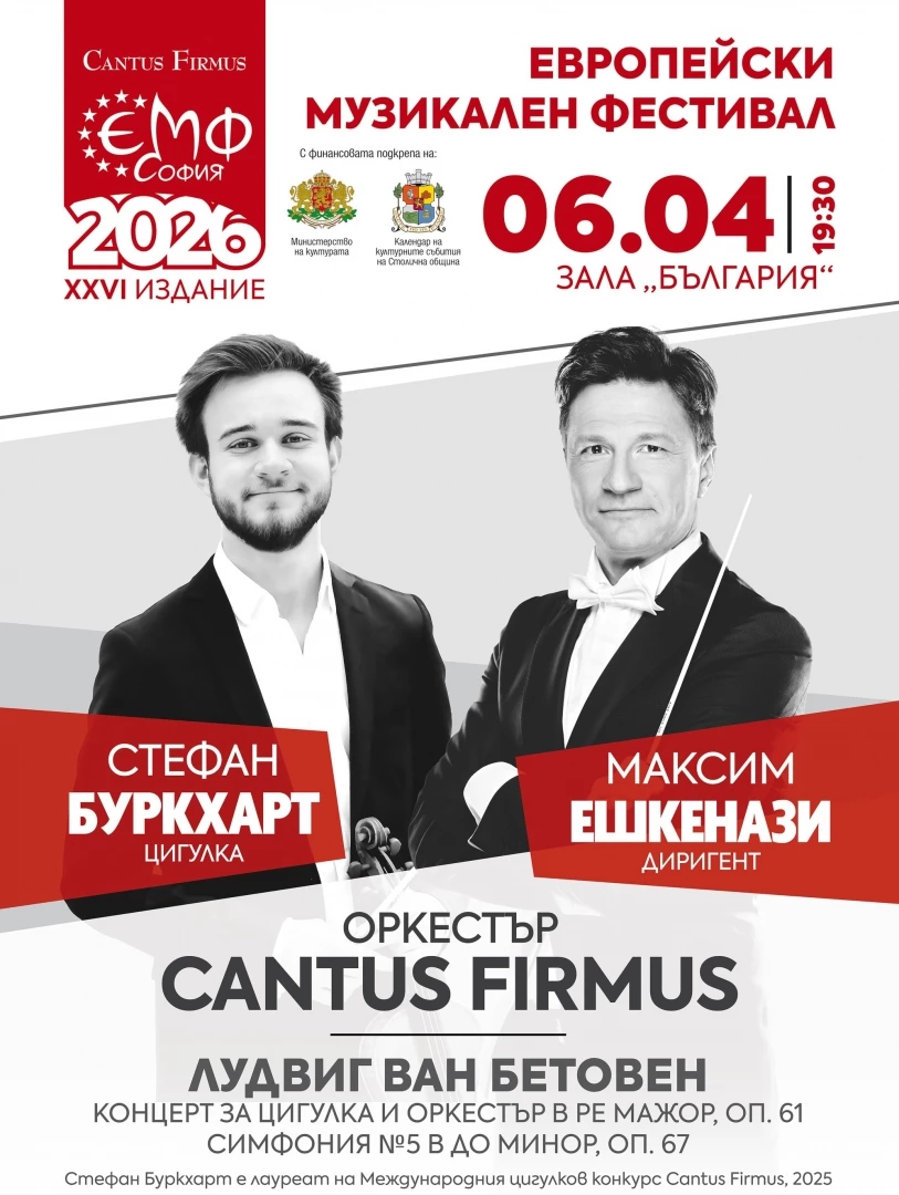 Изпълнението на тези толкова популярни партитури винаги е своеобразен тест за артистите да преодолеят конвенционалния подход и да вложат своя уникален принос към тълкуването на авторските идеи. Това творческо предизвикателство ще поемат музикантите от Оркестър Cantus Firmus заедно с маестро Максим Ешкенази, изявен наш артист, който предпочита пътища отвъд стандартното. Към тях се присъединява и талантливият датски цигулар Стефан Буркхарт, лауреат от първия Международен конкурс Cantus Firmus. Събитието се реализира с финансовата подкрепа на Столична община – Календар на културните събития за 2026 г. и Министерството на културата и в партньорство с ОКИ "Надежда", където ще се проведат репетициите за концерта. Билети са налични на Ticketsbg.com и на касата в зала "България".