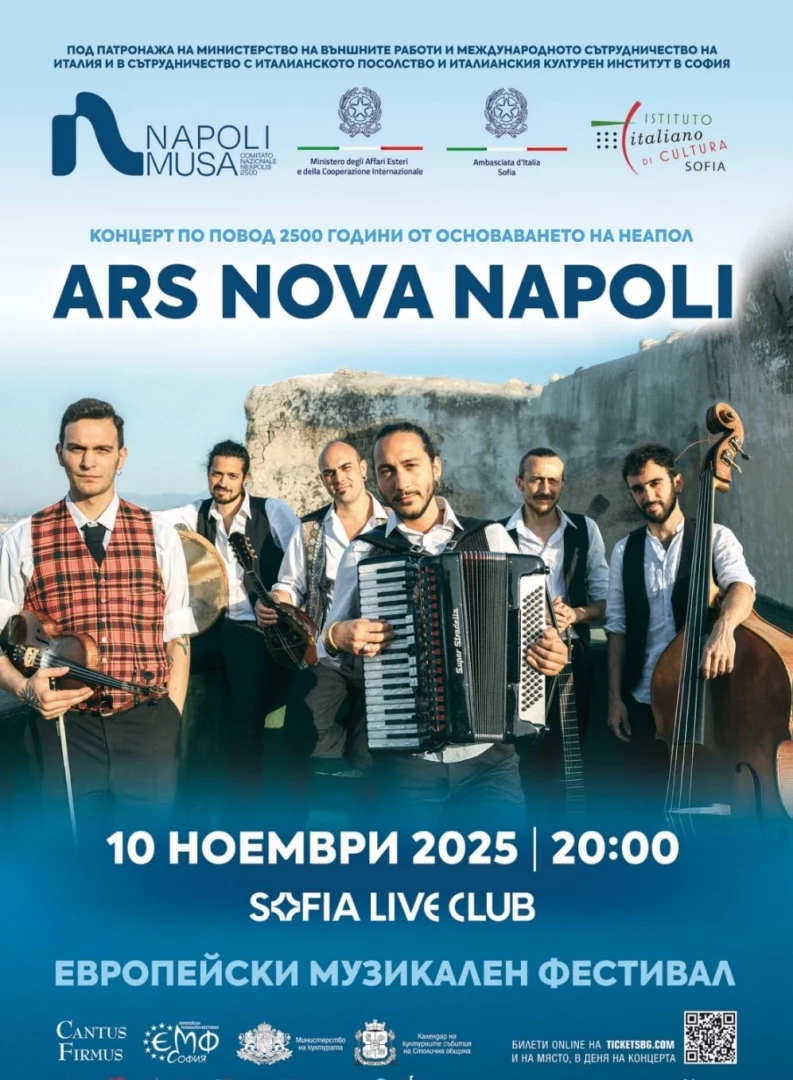 2500 години от основаването на красивия и колоритен италиански град Неапол ще бъдат отбелязани със специално събитие в София, което е част от програмата на 25-ия "Европейски музикален фестивал". У нас ще пристигне една от най-известните и ценени музикални групи от сцената на новия неаполитански фолк – формацията ARS NOVA NAPOLI. В нея участват шестима виртуозни музиканти: Марчело Скуиланте (вокал, акордеон), Микеланджело Нуско (цигулка, тромпет, мандолина), Винченцо Рачопи (мандолина), Джанлука Фуско (вокал, китара, акордеон, гайда), Антонино Анастасия (перкусии) и Бруно Беларди (контрабас), които ще отведат публиката в сърцето на Южна Италия с нови интерпретации на фолклорни песни и оригинални композиции, вдъхновени от Средиземноморската култура. Програмата е изпълнена с енергия, ритъм и страст и преоткрива богатата музикална традиция на Италия, поддържайки живата връзка между минало и съвременност.