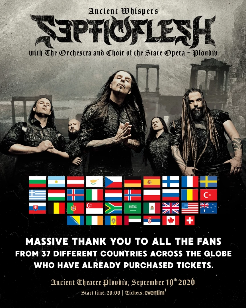Фенове от 37 държави са закупили билети за шоуто на Septicflesh у нас, в това число Швеция, Дания, Франция, Германия, САЩ, Мексико, ОАЕ... и много други, съобщават организаторите от Blue Hills Events. Това е впечатляващо постижение! Когато фенове от толкова различни държави се обединяват за едно събитие, това е сигурен знак за огромно международно признание и силно присъствие на сцената.