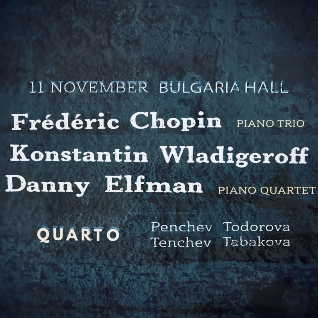Програма: Фридерик Шопен – Трио; Константин Владигеров – Клавирен квартет (световна премиера); Дани Елфман – Клавирен квартет (българска премиера)