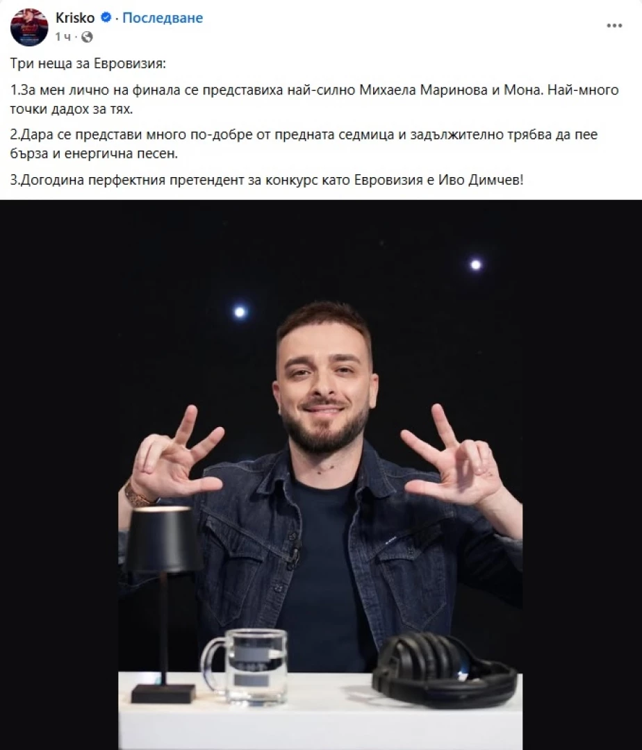 "За мен лично на финала се представиха най-силно Михаела Маринова и Мона. Най-много точки дадох за тях", написа Криско.