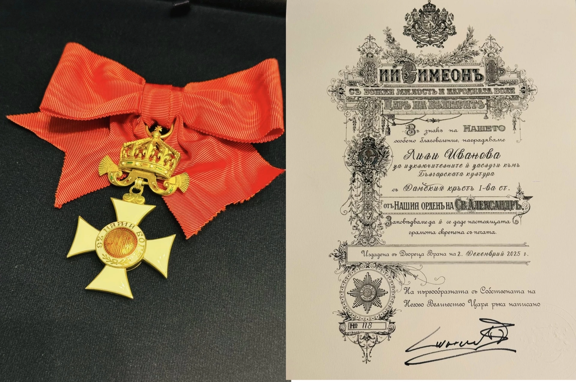 Лили Иванова беше удостоена със специално отличие заради приноса ѝ към българската култура. Певицата получи "Дамски кръст", първа степен, на ордена "Свети Александър". Той ѝ беше връчен лично от Симеон Сакскобургготски в двореца "Врана". Примата на българската музика сама се похвали, като качи снимки във Facebook и изказа благодарността си.