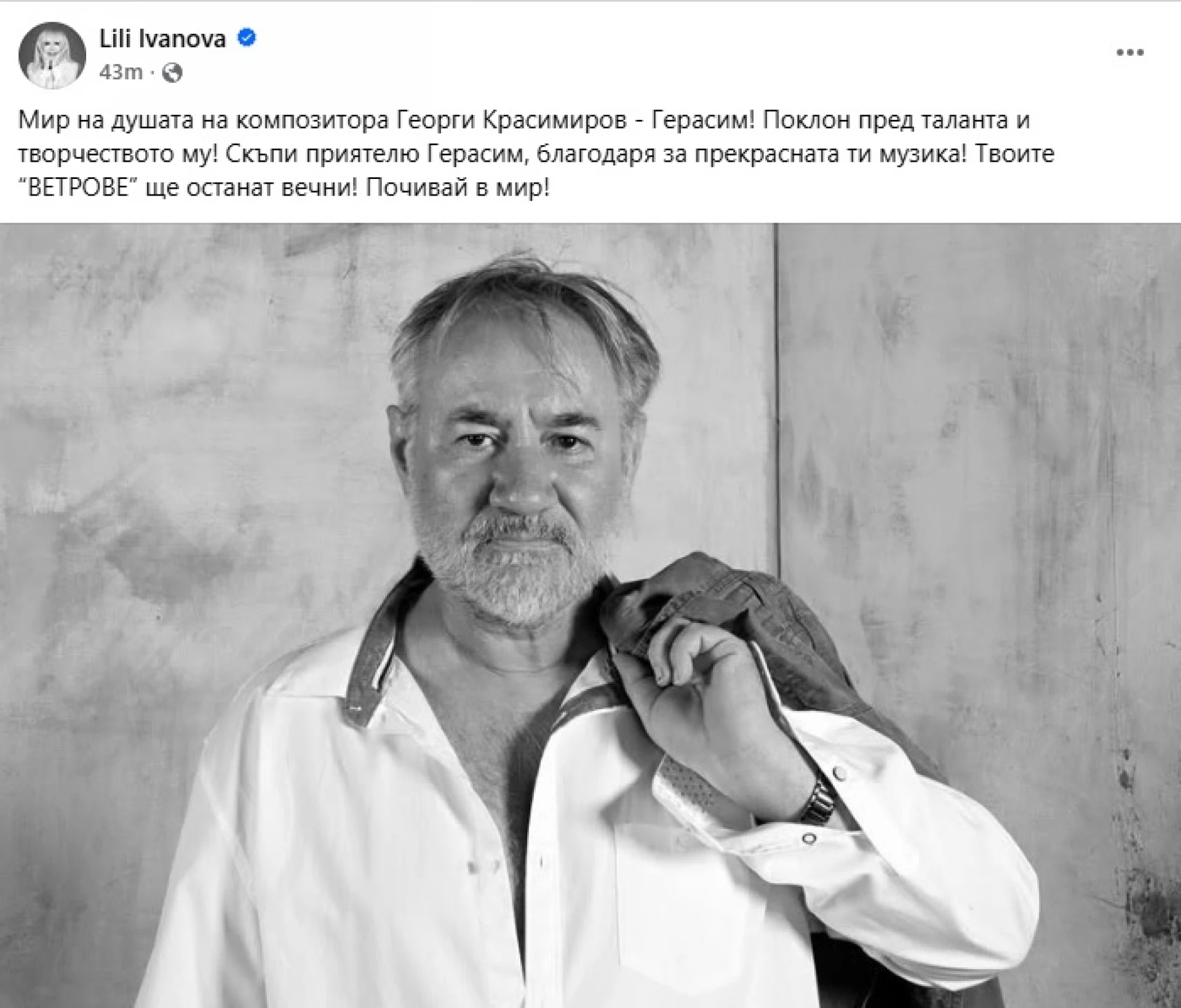 "Мир на душата на композитора Георги Красимиров - Герасим! Поклон пред таланта и творчеството му! Скъпи приятелю Герасим, благодаря за прекрасната ти музика! Твоите "ВЕТРОВЕ" ще останат вечни! Почивай в мир!", това написа Лили Иванова в своя Facebook профил по повод кончината на Красимиров.