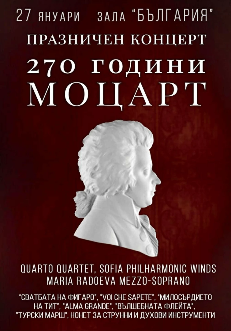 По повод 270-годишнината от рождението на Волфганг Амадеус Моцарт, в зала "България" ни очаква изискан музикален празник, в името на великия гений в историята на музиката. Концертът предлага различна програма с произведения на Моцарт, в които се срещат кристалната яснота и драматична дълбочина на гласа на оперната прима Мария Радоева – мецосопран и неподражаемата хармония, мелодичност и музикално майсторство на изключителните музиканти от Кварто, заедно с Филхармоничния духов квинтет.