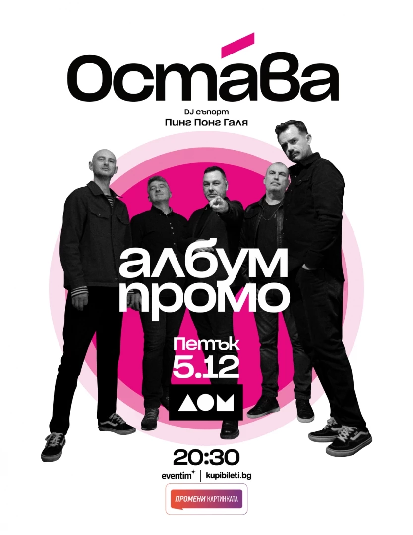 Свилен, Жоро, Дани, Боян и Алекс ще представят "Сърце/Вина" на живо с концерт-промоция на 5 декември в клуб ДОМ в София. Това е и началото на зимното турне на групата, което ще премине през Пловдив на 11 декември, Стара Загора на 27 декември и Бургас на 28 декември. Новите песни обещават още по-зрял и искрен прочит на музикалния свят на Остава - група, която продължава да създава своеобразна карта на чувствата, поколенческите преживявания и малките истини от ежедневието.