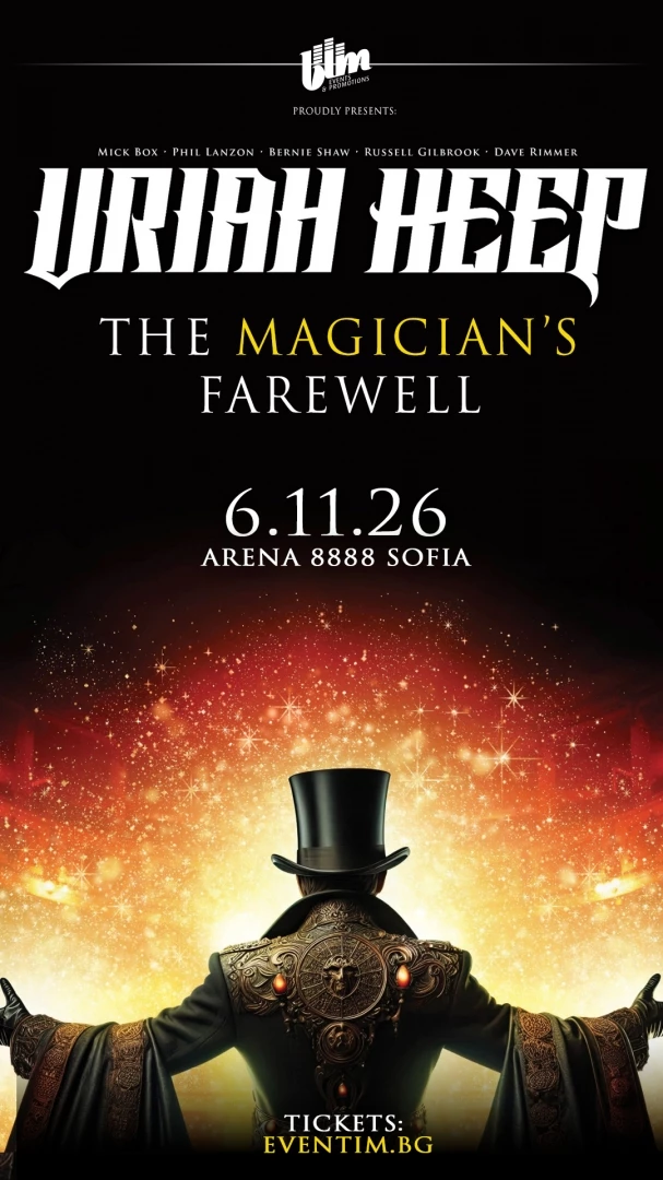 Легендарните Uriah Heep, водени от Mick Box, идват за последен концерт с най-големите си хитове в България на 6 ноември в "Арена 8888" София, като част от турнето им "The Magician’s Farewell", с което отбелязват 55 години рок история. Известни със своите зашеметяващи изпълнения и емблематични хитове, Uriah Heep допринесоха за формирането на британския хеви метъл и прогресив рок. Това е последното турне на групата, с което те слагат край на световната си концертна кариера. С 40 милиона продадени албума и над 4000 концерта, тяхното наследство говори само за себе си.