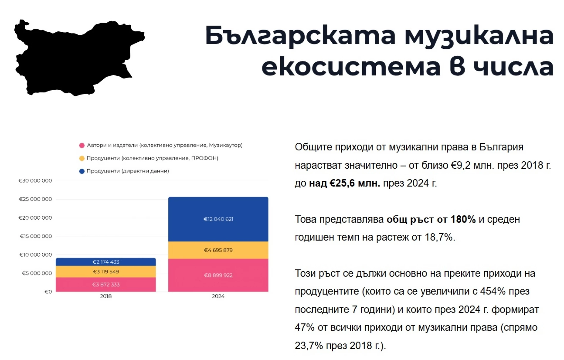 Оказва се, че от 2018 г. до 2024 г. в българската музикална екосистема са се случвали значими процеси във възходяща посока, но имаме още много да работим, не само за да се доближим до другите европейски страни, но и за да започнем да разбираме, че музиката не е по презумпция безплатна, а пиратството не е правилният начин за достъп до любимите ни артисти.