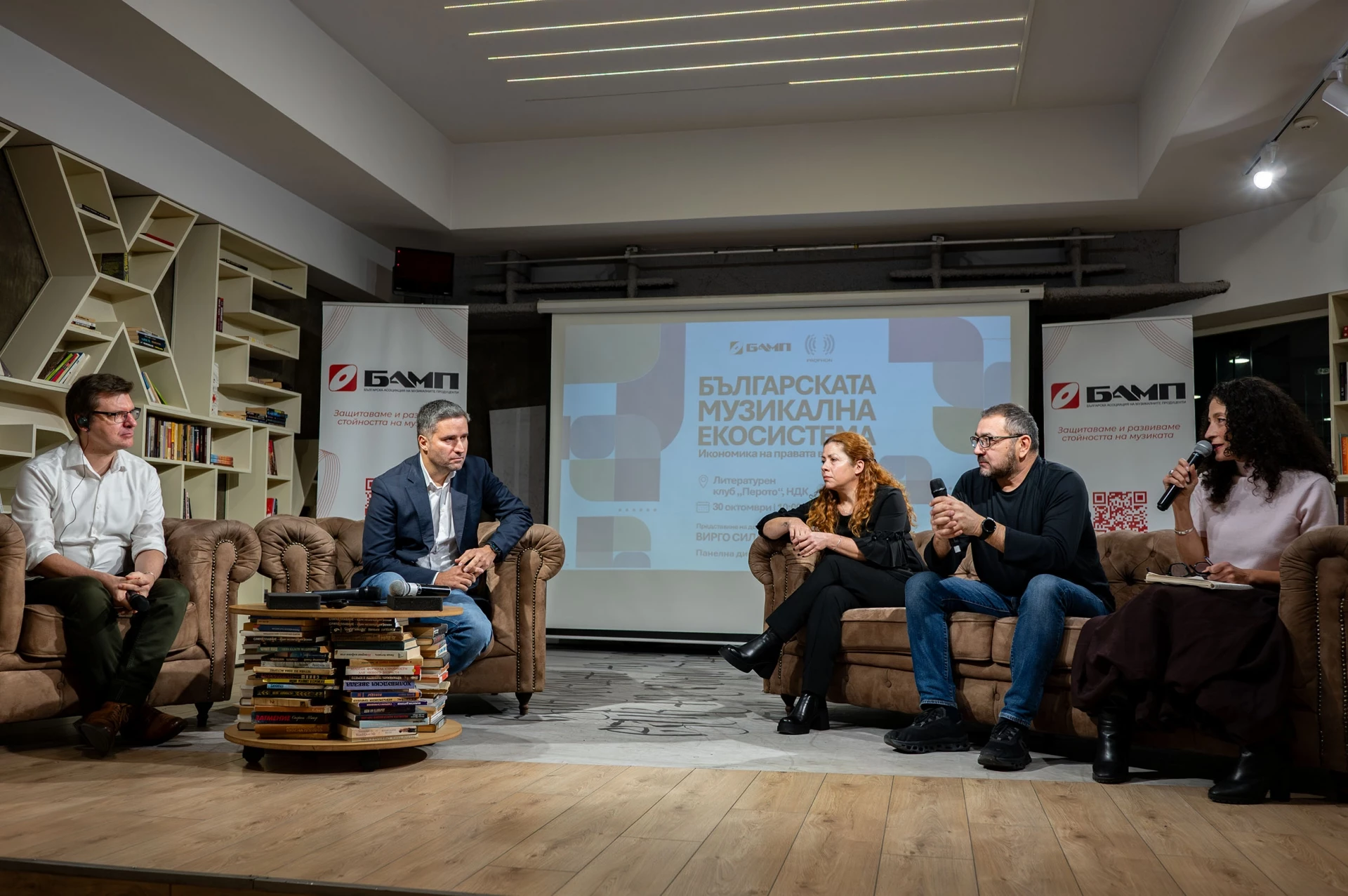 От ляво надясно: авторът на доклада Вирго Силамаа, Мехти Меликов - директор на Дирекция "Авторско право" в Министерство на културата, Десислава Матева - юрист, Станислав Захариев, Universal Music, председател на УС на БАМП и Станислава Армутлиева, основател на Virginia Records по време на представянето на доклада в края на месец октомрви; източник: БАМП