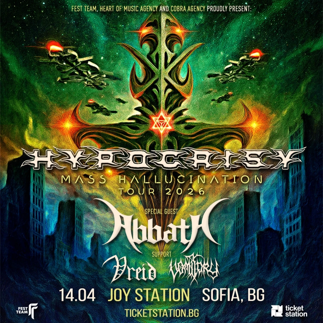 Една от най-обичаните скандинавски метъл банди у нас, HYPOCRISY, се завръща в България през 2026 г. Концертът ще се състои на 14 април в клуб Joy Station, София, като част от новото мащабно турне Mass Hallucination, което ще премине през 26 европейски града и ще събере някои от най-силните имена на екстремната сцена. Билетите за концерта на шведската банда и метъл шайката, с която тръгва на път, започват от 66 лв. и влизат в продажба на 17 октомври от 11:00 ч. в мрежата на ticketstation.bg.