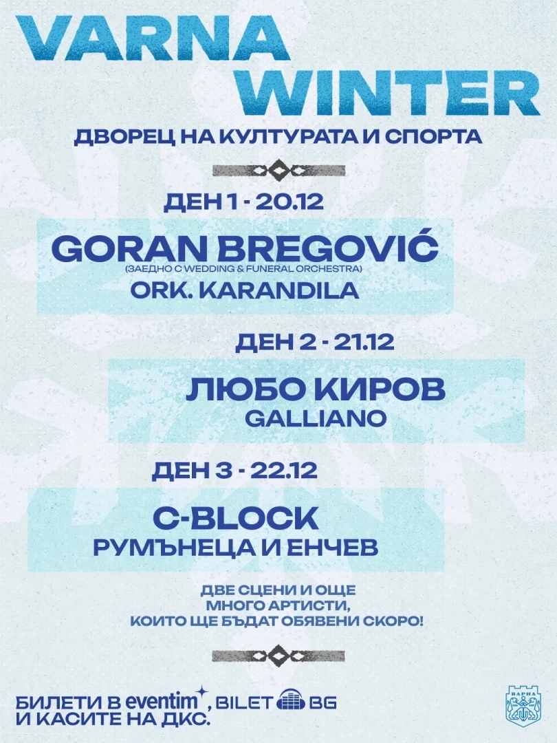 Следете отблизо страницата на Varna Winter Festival, за да научите кои са и останалите артисти от фестивала. Закупете своите билети на цени от 35 до 120 лв. за различните категории места. Билети в мрежата на Bilet.bg и на касите на ДКС.