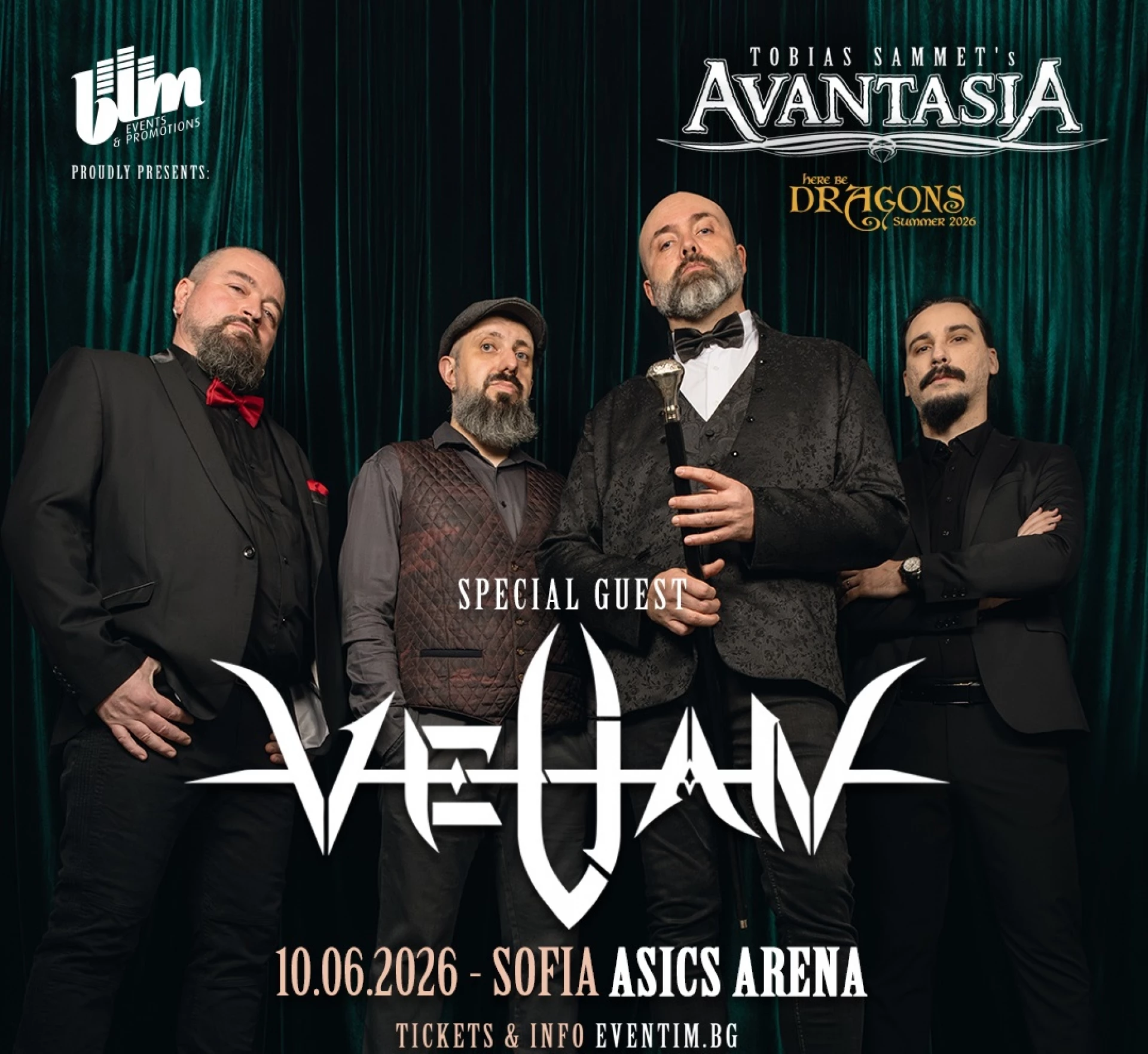 За първи път в София ще можем да видим и чуем немската супер група AVANTASIA, които ще свирят на 10 юни 2026-а в Asics Arena, с над двучасово шоу. Преди тях на сцената ще излязат VELIAN - резултат от обединените усилия на четирима музиканти от българската ъндърграунд метъл сцена. Концепцията на групата и нейното послание почиват на деструктивния материализъм, липсата на ценности и стабилност, които характеризират нашето общество и съвременния начин на живот. Стиймпънк сценичните костюми, видеоклиповете на бандата и нейната мултимедия, част от концертните ѝ изпълнения, допринасят за нейния имидж и визия и са важна част от цялостната аудио-визуална картина, описваща света на VELIAN.