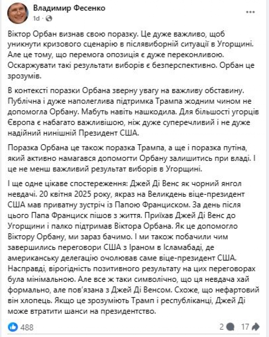 Шега или не, но вече по-сериозно Фесенко отбелязва, че изборите в Унгария бяха поражение не само за Орбан, но и за Тръмп, който го подкрепяше, както и за Путин, който активно се опитваше да му помогне да остане на власт.