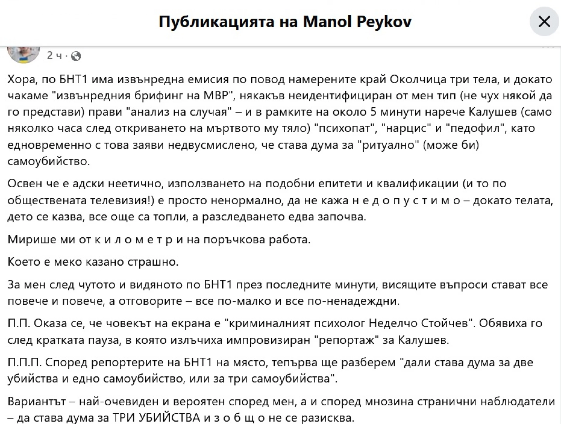 "Хора, по БНТ1 има извънредна емисия по повод намерените край Околчица три тела, и докато чакаме "извънредния брифинг на МВР", някакъв неидентифициран от мен тип (не чух някой да го представи) прави "анализ на случая" – и в рамките на около 5 минути нарече Калушев (само няколко часа след откриването на мъртвото му тяло) "психопат", "нарцис" и "педофил", като едновременно с това заяви недвусмислено, че става дума за "ритуално" (може би) самоубийство.