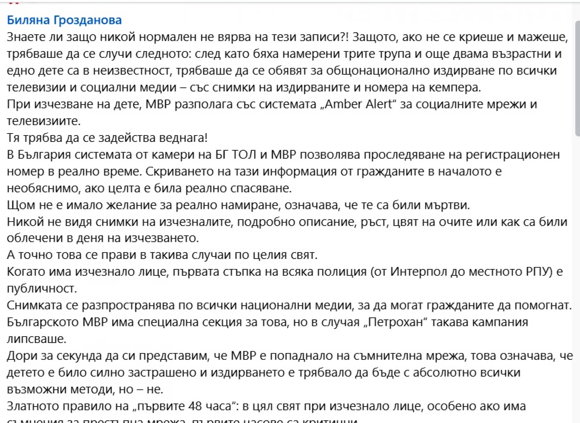 "Знаете ли защо никой нормален не вярва на тези записи?! Защото, ако не се криеше и мажеше, трябваше да се случи следното: след като бяха намерени трите трупа и още двама възрастни и едно дете са в неизвестност, трябваше да се обявят за общонационално издирване по всички телевизии и социални медии – със снимки на издирваните и номера на кемпера." Това пише в свой пост във Facebook Биляна Грозданова в коментар за трагедията "Петрохан-Околчица".