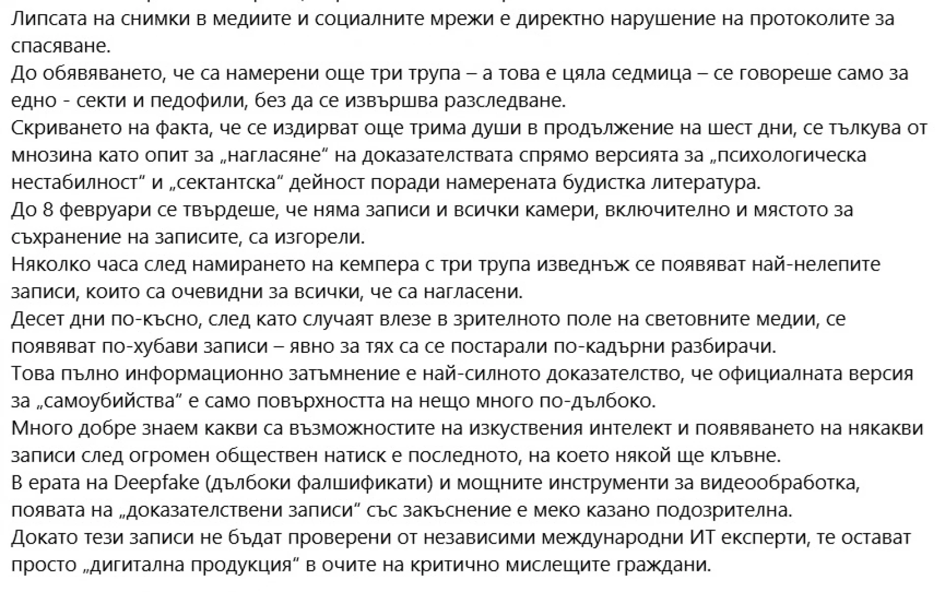 "Златното правило на „първите 48 часа“: в цял свят при изчезнало лице, особено ако има съмнения за престъпна мрежа, първите часове са критични. Липсата на снимки в медиите и социалните мрежи е директно нарушение на протоколите за спасяване. До обявяването, че са намерени още три трупа – а това е цяла седмица – се говореше само за едно - секти и педофили, без да се извършва разследване", допълва още тя.
