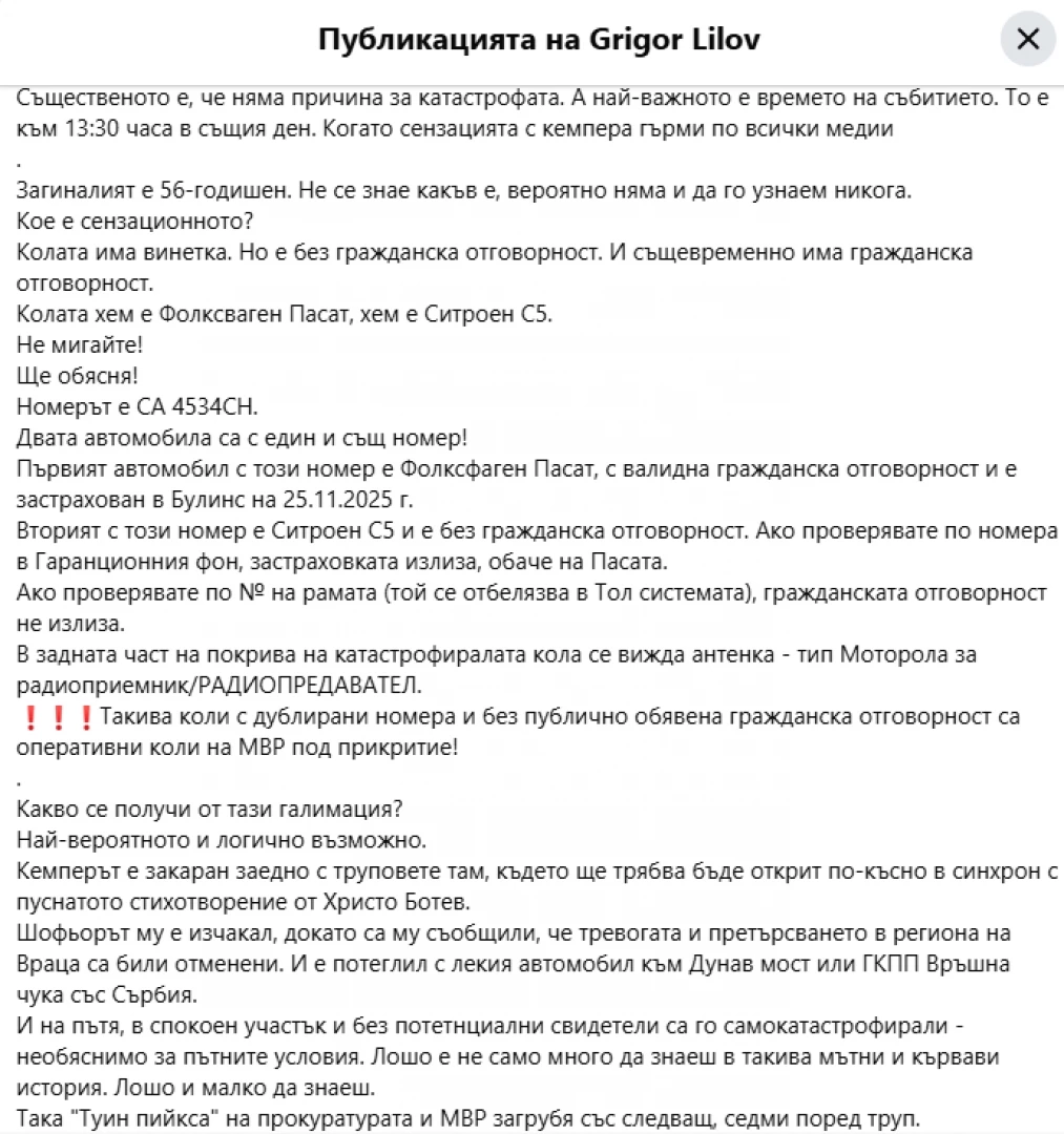 На фона на това ето и мнение на журналиста Григор Лилов, който пък посочва странна катастрофа с още един труп, случила се в деня на намирането на кемпера с трите тела в него. Публикуваме без съкращения: