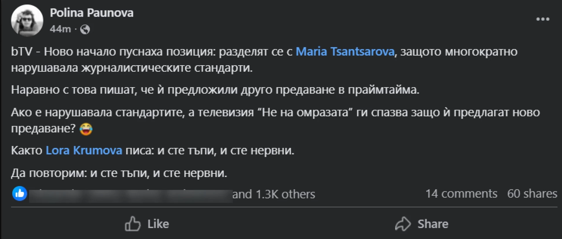 "Както Лора Крумова писа: и сте тъпи, и сте нервни. Да повторим: и сте тъпи, и сте нервни", цитира още Полина Паунова.
