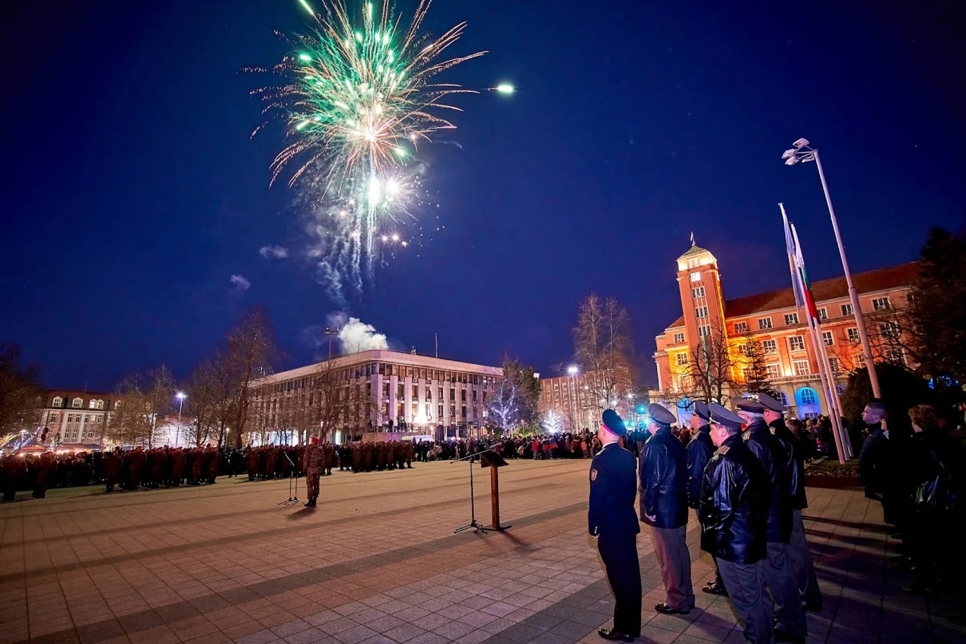 След едноминутно мълчание в знак на почит към загиналите за свободата на България, центърът на Плевен бе огласен от гърмежи, празнична заря освети небето над града.