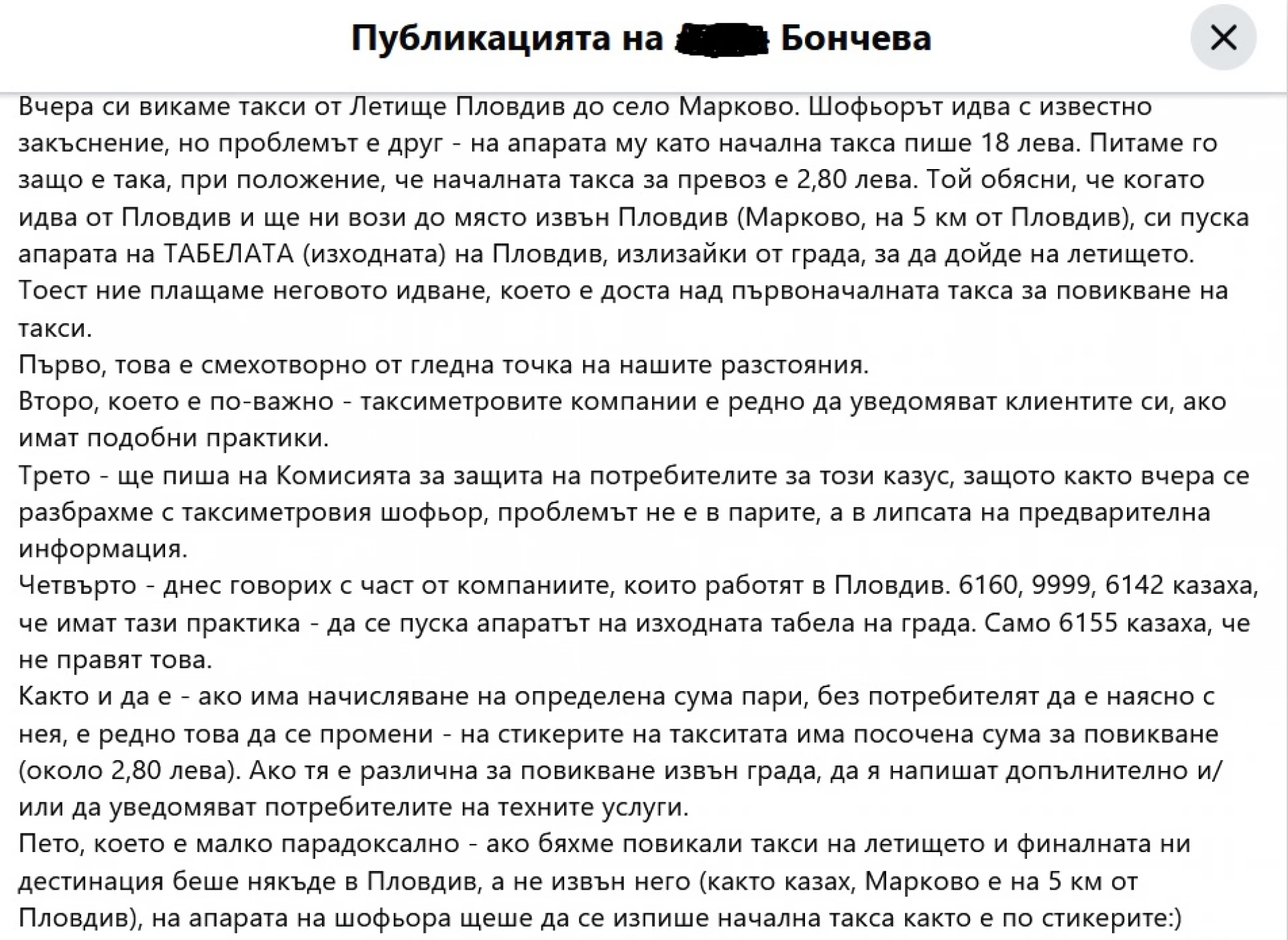 Повечето фирми отрекоха въпросната заявка от сигнала във Facebook да е била при тях. В една от фирмите са имали подобна заявка, но твърдят, че апаратът е бил включен от летище "Пловдив" и цялата сума до село Марково е излязла 27 лв., което означава, че предвид разстоянието малко над 17 км няма как първоначалната такса да е била 18 лв. - това е тяхното обяснение - ОЩЕ: Цената на такситата в София скача драстично