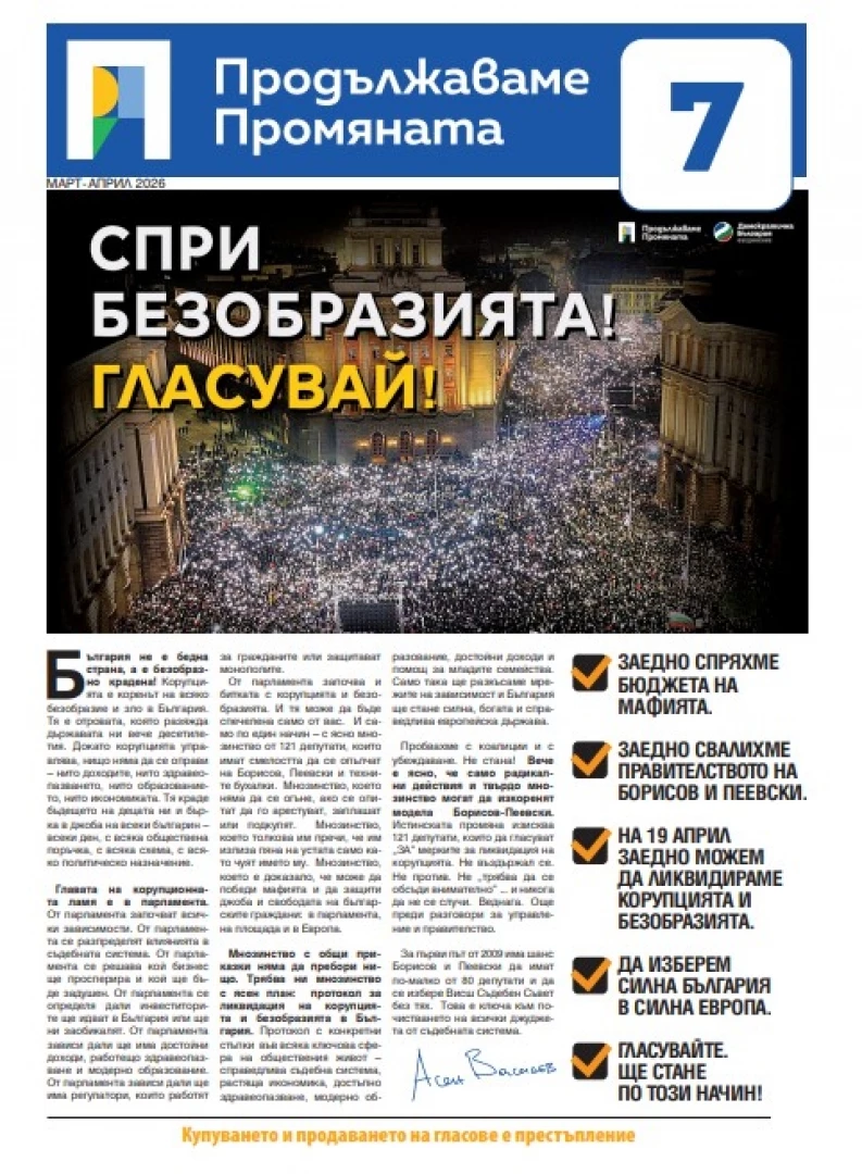 От "Продължаваме промяната" вярват, че само с ясно мнозинство от 121 депутати може да се започне битката с корупцията и безобразията. Вестникът напомня за многохилядните протести през декември 2025 г., които спряха бюджета на мафията, свалиха правителството на Борисов и Пеевски, и призовава за гражданска активност за ликвидиране на корупцията и безобразията в страната.