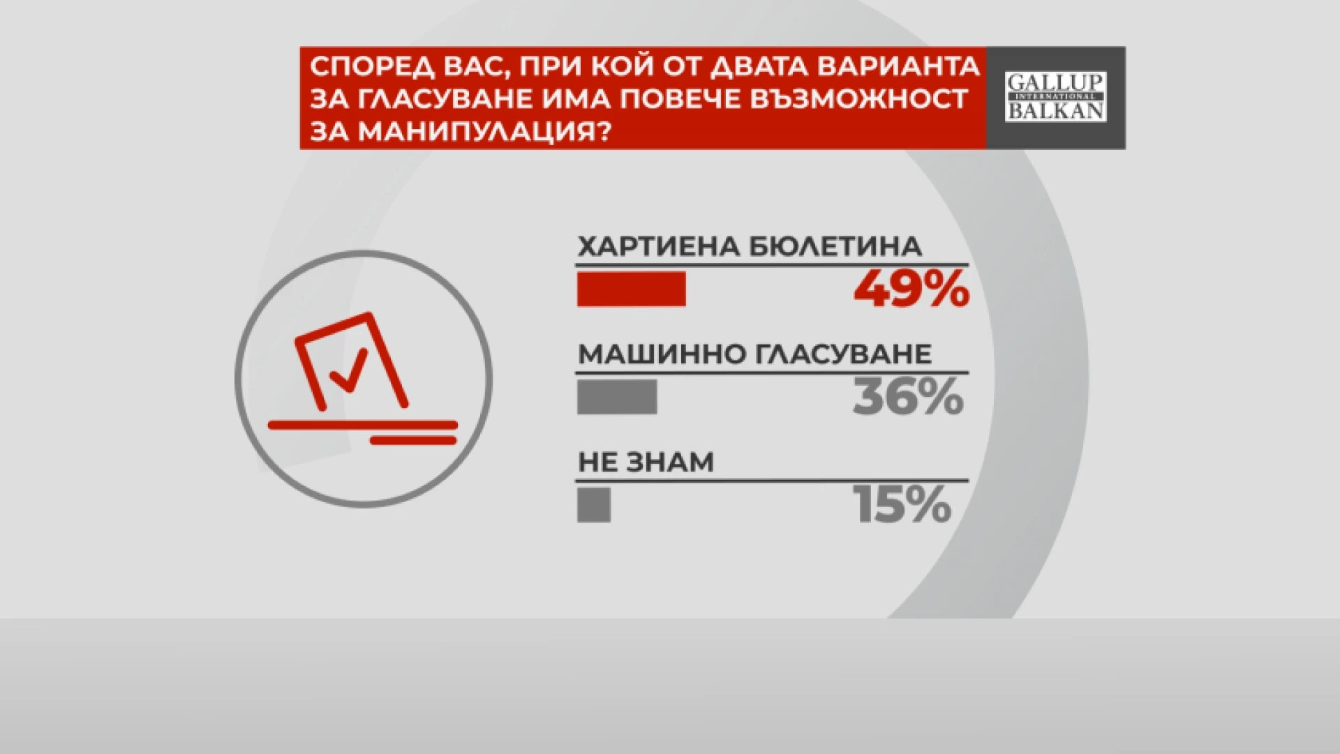 И още от експресното проучване - според 49% от хората по-голяма манипулация при вота може да се получи при гласуване с хартиена бюлетина. Почти половината от българите са на мнение, че именно технологията на гласуването е това, което прави изборите по-честни.