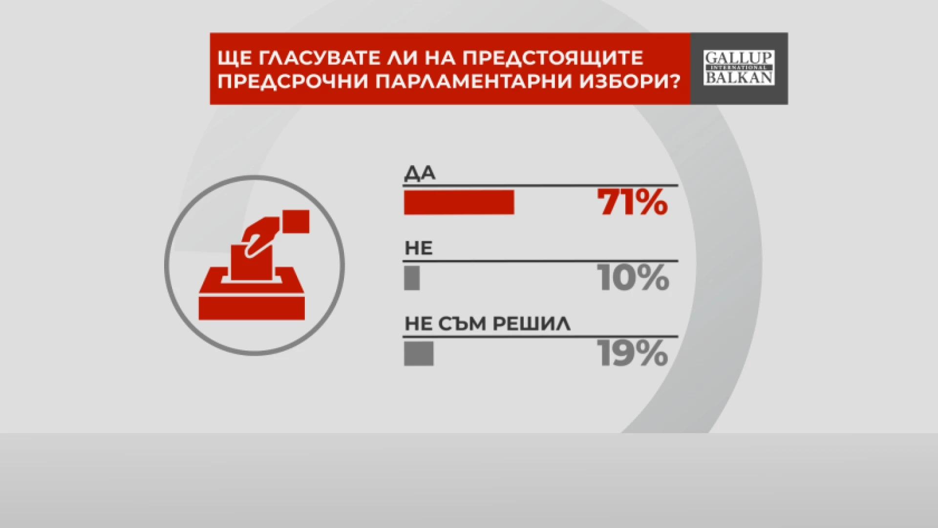 71% от българите заявяват, че ще гласуват на предстоящите предсрочни парламентарни избори. Това показва проучване на "Галъп Интернешънъл Болкан" за предаването "Референдум", излъчено във вторник вечер. Според данните 10 на сто казват "не" на изборите, а 19% все още не са взели решение.