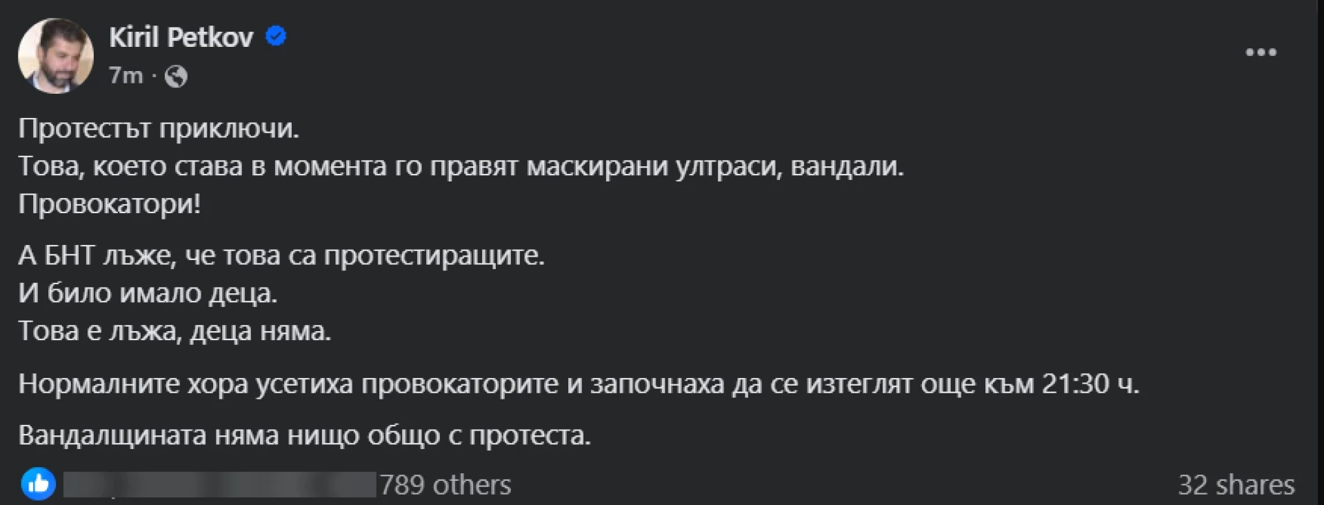 "Протестът приключи. Това, което става в момента го правят маскирани ултраси, вандали. Провокатори! А БНТ лъже, че това са протестиращите. И било имало деца. Това е лъжа, деца няма." Това написа в профила си в социалните мрежи бившият премиер и бивш съпредседател на "Продължаваме промяната" Кирил Петков по повод провокациите в края на мащабния протест срещу управляващото мнозинство.