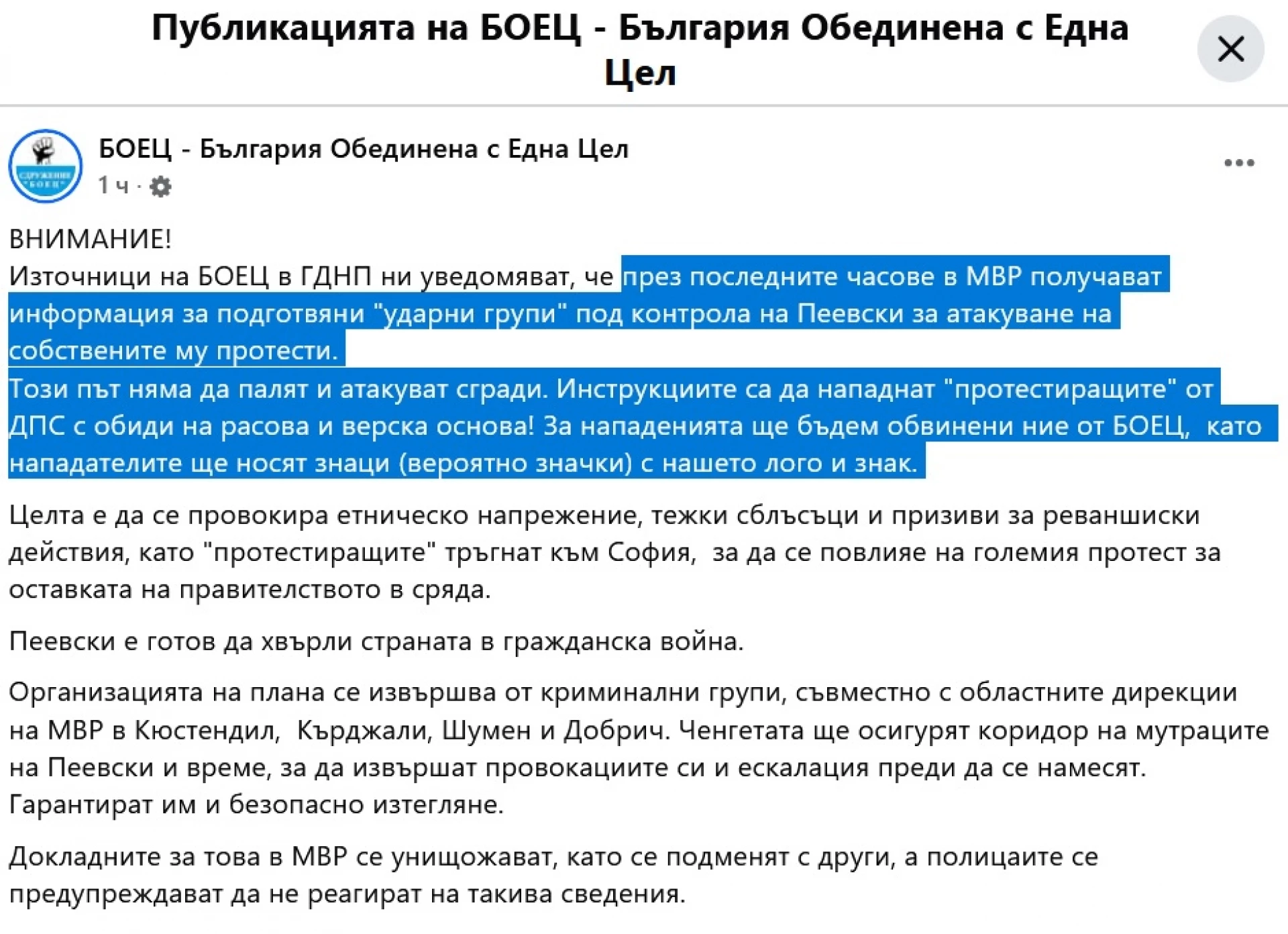 "(..) през последните часове в МВР получават информация за подготвяни "ударни групи" под контрола на Пеевски за атакуване на собствените му протести.